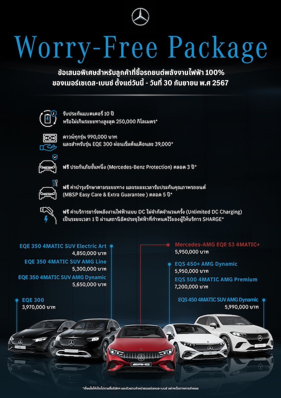 - แคมเปญ “Worry Free”: รับข้อเสนอสุดพิเศษจากเมอร์เซเดส-เบนซ์ สำหรับลูกค้าที่ซื้อรถยนต์พลังงานไฟฟ้า 100% กับแพ็คเกจข้อเสนอทางการเงิน ประกันชั้น 1 และโปรแกรม MBSP