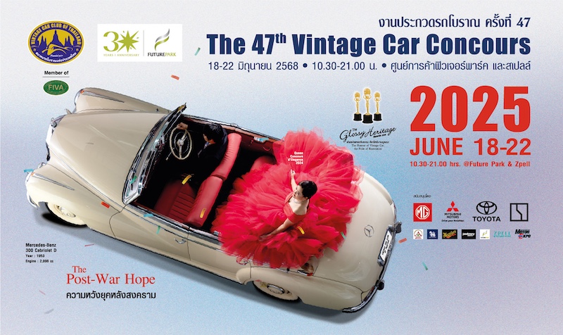 ชม “งานประกวดรถโบราณ ครั้งที่ 47” ณ ศูนย์การค้าฟิวเจอร์พาร์ค และสเปลล์ ระหว่างวันที่ 18-22 มิถุนายน 2568 ติดตามรายละเอียดเพิ่มเติมได้ที่ vintagecarclub.or.th และ facebook.com/VintageCarClub