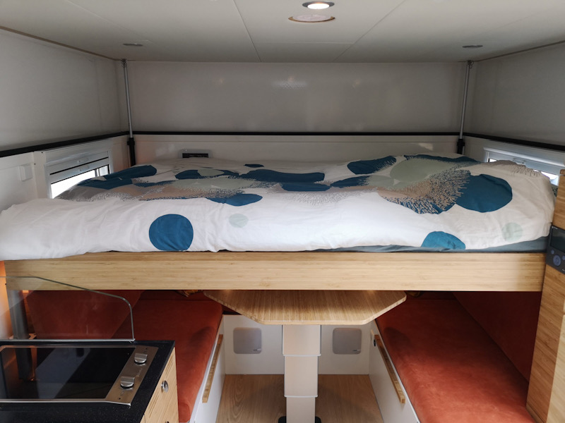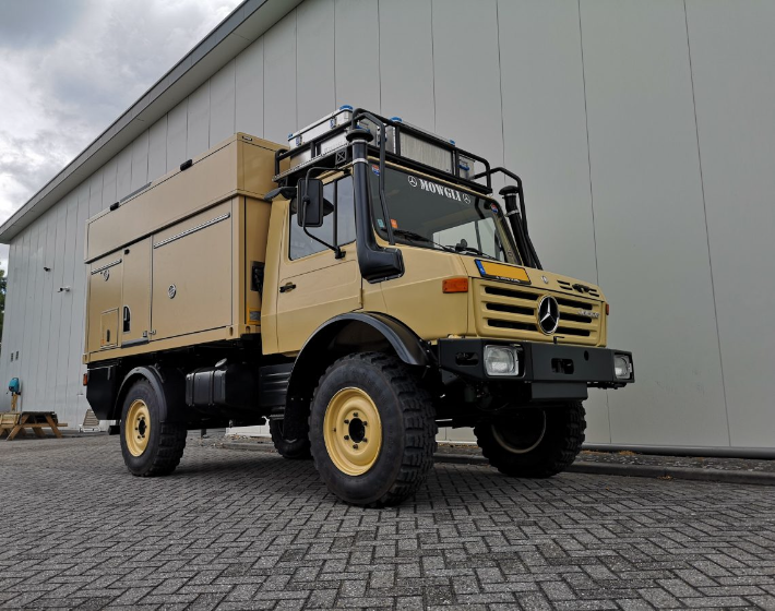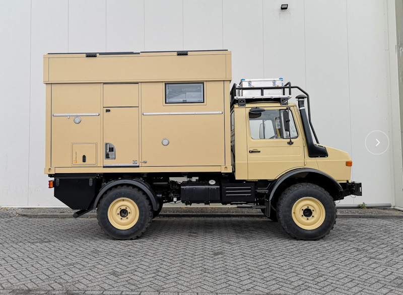 ยูนิม็อค คันนี้ ดัดแปลงมาจากรุ่น ยู 1300 Unimog U1300 โดยส่วนของหลังคาสามารถยกสูง เพื่อเพิ่มความสูงของห้องนอนได้ มาพร้อมกล่องกันน้ำวางบนตะแกรงบนหลังคา รวมทั้งที่เก็บของใต้แชสซีส์ และกล่องหลังรถต่างหาก โดยสามารถแต่งให้เก็บรถมอเตอรไซค์วิบากได้ถึง 2 คัน