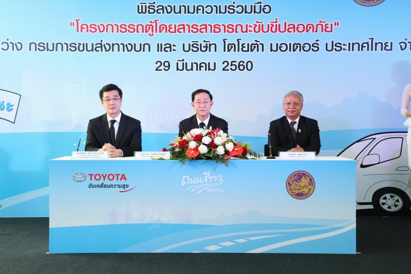 นายอาคม เติมพิทยาไพสิฐ รัฐมนตรีว่าการกระทรวงคมนาคม ร่วมด้วย นายสนิท พรหมวงษ์ อธิบดีกรมการขนส่งทางบก และ นายวุฒิกร สุริยะฉันทนานนท์ รองกรรมการผู้จัดการใหญ่ บริษัท โตโยต้า มอเตอร์ ประเทศไทย จำกัด ลงนามบันทึกความร่วมมือ “โครงการรถตู้โดยสารสาธารณะขับขี่ปลอดภัย” โดยจัดพิธีฯ ในวันพุธที่ 29 มีนาคม ที่ผ่านมา ณ ศูนย์ขับทดสอบรถ “Toyota Driving Experience Park” ถนนบางนา – ตราด กิโลเมตรที่ 3 กรุงเทพมหานคร