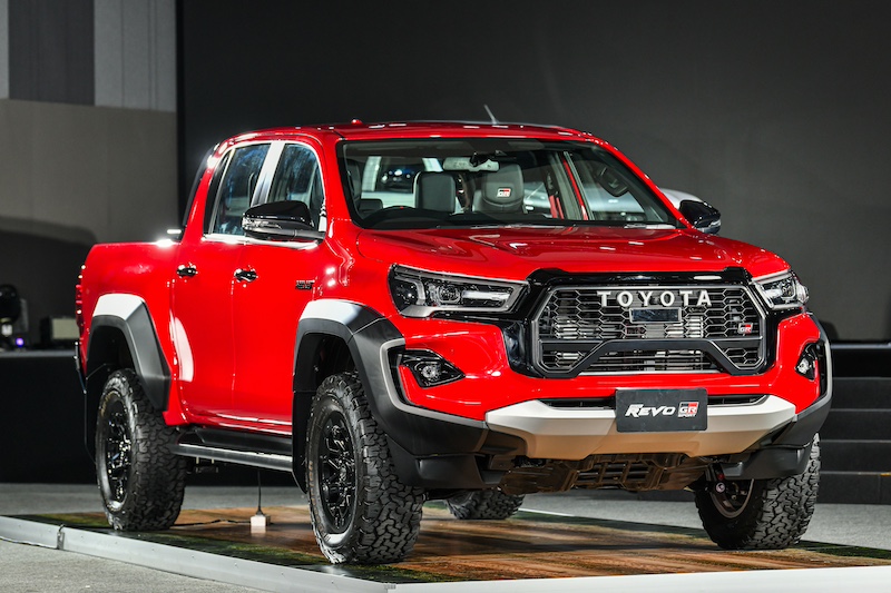 3. Hilux Revo GR-Sport 4x4 นิยามความแกร่ง สปอร์ตพรีเมี่ยม กระบะสายพันธ์แกร่งรุ่นเรือธงที่ได้รับแรงบันดาลใจในการออกแบบจากรถแข่งออฟโรดแรลลี่ ด้วยสมรรถนะการขับขี่เป็นเลิศกับเครื่องยนต์ 2.8 GD Super Power ปรับจูนใหม่ 224 แรงม้า แรงบิด 550 นิวตัน–เมตร ปรับจูนช่วงล่าง เพิ่มความกว้างฐานล้อ (wide tread) ด้านหน้าขึ้นอีก 140 มม ด้านหลัง 155 มม และเปลี่ยนเบรกหลังเป็นดิสก์เบรก ช่วยเพิ่มเสถียรภาพในการขับขี่ ยึดเกาะถนนได้ดีมากขึ้น
