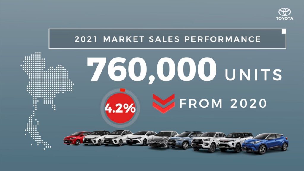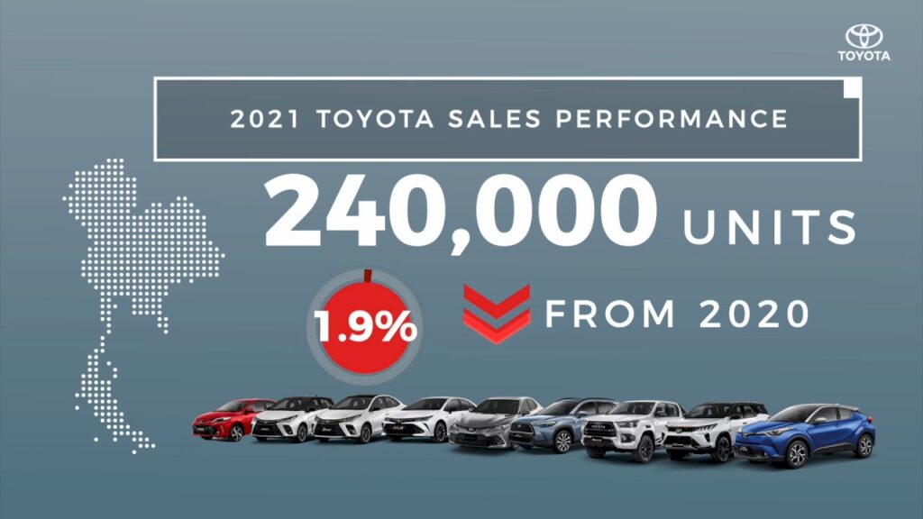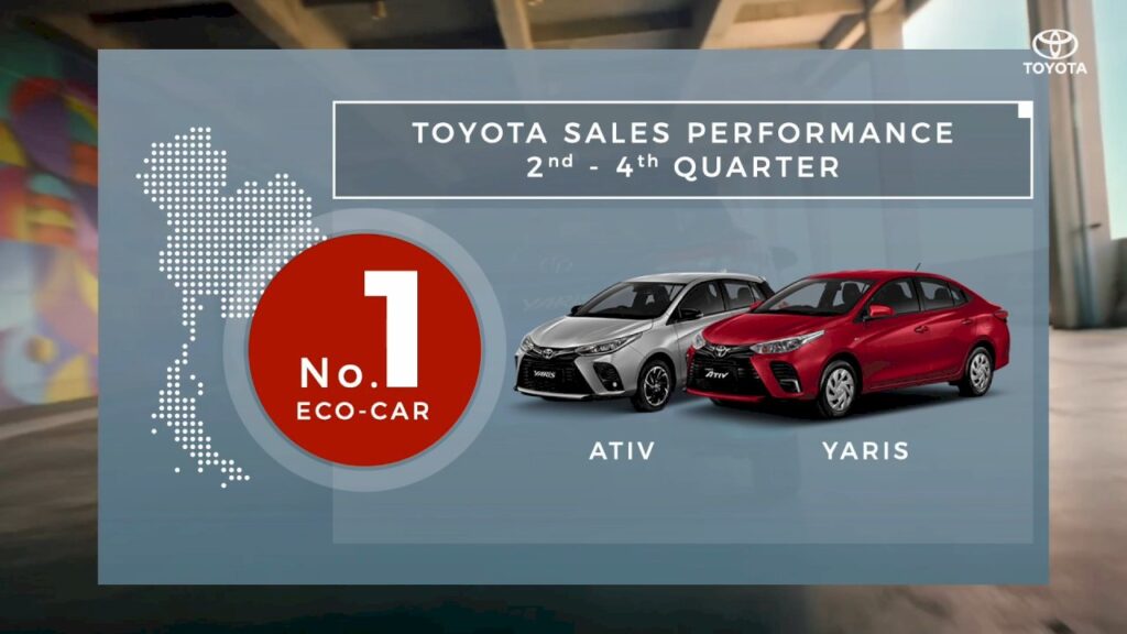 มร. ยามาชิตะ เผยถึงยอดขายของโตโยต้าในปีที่ผ่านมาว่า “สำหรับยอดขายของโตโยต้าในปี 2564 นั้น ยอดขายรวมของเราอยู่ที่ประมาณ 239,723 คัน หรือลดลง 1.9% เมื่อเทียบกับปีที่ผ่านมา และเรายังคงครองส่วนแบ่งทางการตลาดเป็นอันดับ 1 หรือเท่ากับ 31.6% ของยอดขายรถยนต์ทั้งหมด ซึ่งหากว่ากันตามตรง ถือว่าต่ำกว่าที่เราคาดการณ์ไว้ แต่ถ้าเราดูยอดขายของปีที่แล้วจะเห็นได้ว่าสถานการณ์ของเราเริ่มฟื้นตัวดีขึ้นตั้งแต่ไตรมาสที่ 2 เป็นต้นมา สืบเนื่องมาจากการพัฒนาผลิตภัณฑ์ให้ดียิ่งขึ้น ตลอดจนการดำเนินกิจกรรมทางการตลาดที่สอดคล้องกับวิถีชีวิตแบบใหม่ เช่น การขายผ่านช่องทางออนไลน์ ถ้าเราลองดูที่ยอดขายของโตโยต้าในระหว่างช่วงไตรมาสที่ 2 ถึงไตรมาสที่ 4 จะเห็นได้ว่าส่วนแบ่งทางการตลาดของเราอยู่ที่ 32.5% ซึ่งเป็นระดับที่ไกล้เคียงกับในปี 2562 หรือช่วงก่อนที่โรคโควิด-19 จะระบาด โดยในส่วนของยอดขายของไฮลักซ์ รีโว่ นั้น มีส่วนแบ่งทางการตลาดอยู่ที่ 39.1% ซึ่งสูงกว่าของปี 2562 ในขณะที่ เอทีฟ และ ยาริส นั้น ก็สามารถครองอันดับ 1 ในตลาดรถ        อีโคคาร์”