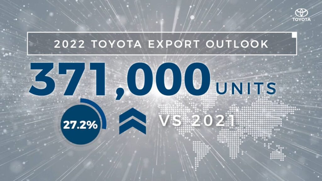 สำหรับเป้าหมายการส่งออกรถยนต์สำเร็จรูปของโตโยต้าในปีนี้ เราคาดว่าความต้องการของตลาดต่างประเทศจะเพิ่มสูงขึ้น โดยเราตั้งเป้าปริมาณการส่งออกรถยนต์อยู่ที่ 371,000 คัน หรือเพิ่มขึ้น 27.2% เมื่อเทียบกับปีที่แล้ว และเราตั้งเป้าการผลิตรถยนต์ทั้งหมดของปี 2565 อยู่ที่ ราว 647,000 คัน หรือเพิ่มขึ้น 25.9% จากปีที่ผ่านมา       “