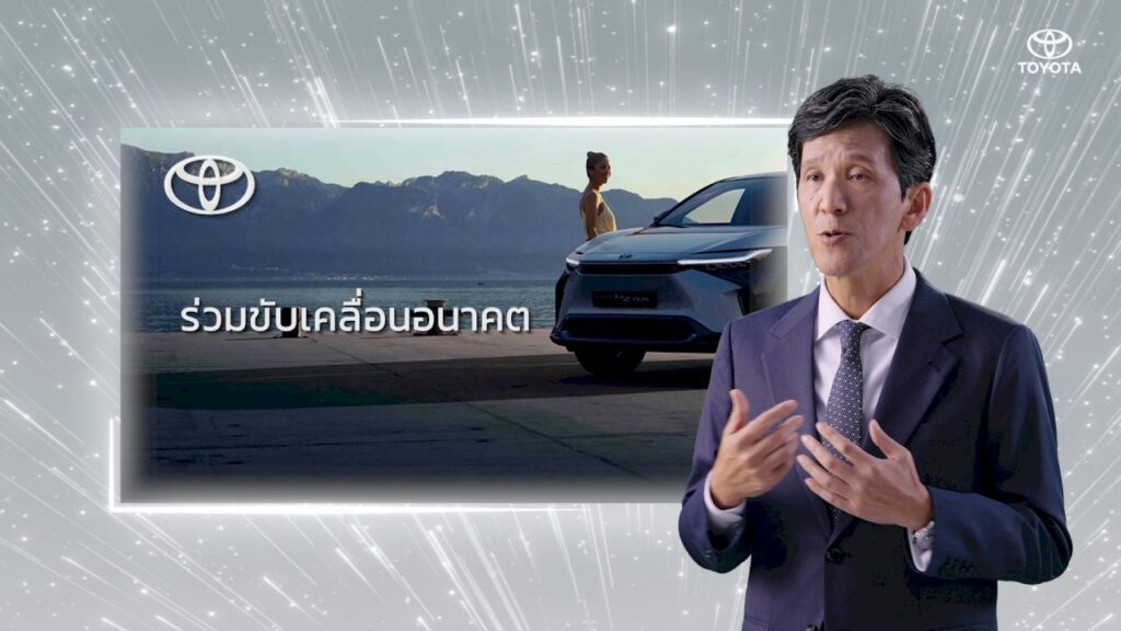 มร. ยามาชิตะ เผยว่า ก่อนอื่นผมขอเล่าให้ฟังถึงกลยุทธ์ของโตโยต้าในการมุ่งสู่ความเป็นกลางทางคาร์บอน อย่างที่ทุกท่านทราบกันดีว่าโตโยต้ามุ่งมั่นที่จะสร้างความเป็นกลางทางคาร์บอนให้สำเร็จภายในปี 2593 โดยเมื่อวันที่ 14 ธันวาคม 2564 คุณอากิโอะ โตโยดะ กรรมการผู้จัดการใหญ่ โตโยต้า มอเตอร์ คอร์ปอเรชั่น ได้ประกาศไว้ว่าโตโยต้ามีกลยุทธ์มุ่งสู่ความเป็นกลางทางคาร์บอน โดยเฉพาะอย่างยิ่งคือกลยุทธ์ด้านยานยนต์ไฟฟ้าพลังงานแบตเตอรี่ ท่านได้ประกาศไว้ว่าโตโยต้าจะผลิตรถยนต์ไฟฟ้าพลังงานแบตเตอรี่ครบทั้ง 30 รุ่น ภายในปี 2573 โดยรวมไปถึงรถซีรีส์ bZ จำนวน โมเดล ซึ่งมาพร้อมกับแพลตฟอร์มที่พัฒนาขึ้นมาสำหรับรถยนต์ไฟฟ้าพลังงานแบตเตอรี่โดยเฉพาะ โตโยต้ามุ่งมั่นที่จะขายรถยนต์ไฟฟ้าพลังงานแบตเตอรี่ให้ได้ทั้งสิ้น 3.5 ล้านคัน ภายในปี 2573  ทั้งนี้ โตโยต้าทุ่มเงินลงทุน 1.2 ล้านล้านบาทเพื่อพัฒนารถยนต์ไฟฟ้าพลังงานแบตเตอรี่ โดยที่เงิน 0.6 ล้านล้านบาทนั้นเป็นการลงทุนด้านแบตเตอรี่ และยังลงทุนอีก 1.2 ล้านล้านบาท สำหรับรถยนต์ไฟฟ้าแบบไฮบริด รถยนต์ไฟฟ้าแบบปลั๊กอินไฮบริด และรถยนต์ไฟฟ้าแบบเซลล์เชื้อเพลิง ภายในปี 2573
