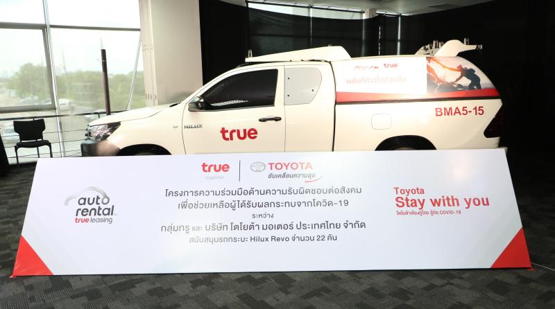 นายขจร เจียรวนนท์ กรรมการบริหาร บริษัท ทรู คอร์ปอเรชั่น จำกัด (มหาชน) กรรมการผู้จัดการใหญ่ บริษัท ทรูลิสซิ่ง จำกัด กล่าวว่า “ในช่วงวิกฤตโควิด-19 คนไทยทุกภาคส่วน ต่างร่วมแรงร่วมใจดูแลช่วยเหลือซึ่งกันและกัน เพื่อให้สามารถผ่านพ้นสถานการณ์นี้ไปได้อย่างราบรื่น โดยกลุ่มทรูเองได้นำศักยภาพเทคโนโลยีช่วยอำนวยความสะดวกร่วมดูแลคนไทย และสนับสนุนภารกิจบุคลากรทางการแพทย์อย่างต่อเนื่องหลากหลายรูปแบบในโรงพยาบาลต่างๆทั่วประเทศ ภายใต้โครงการ “ทรู เคียงคู่สู้โควิด” และครั้งนี้ เป็นที่น่ายินดีที่ได้ร่วมกับพันธมิตรที่มีความแข็งแกร่งอย่าง บริษัท โตโยต้า มอเตอร์ ประเทศไทย จำกัด จัดกิจกรรมช่วยเหลือสังคม โดยจะนำความเชี่ยวชาญของทรู ลีสซิ่ง เข้ามาบริหารจัดการรถโตโยต้า ไฮลักซ์ รีโว่ 22 คัน ที่ได้รับมอบมา ด้วยการติดตั้งอุปกรณ์ในรถเพิ่มเติม และจัดเตรียมทีมปฏิบัติการ เพื่อใช้ประโยชน์ในการขนส่งอาหาร สิ่งของจำเป็นในชีวิตประจำวัน ให้ถึงมือผู้ที่ได้รับความเดือดร้อน โดยจะประเดิมลำเลียงของที่มีผู้มาบริจาคกับทางสโมสรฟุตบอล ทรู แบงค็อก ยูไนเต็ด ไปยังชุมชนบริเวณธรรมศาสตร์ สเตเดียม ศูนย์รังสิต จำนวน 7 ชุมชน และที่นิคมอุตสาหกรรมแพรกษา พร้อมมีแผนจะนำส่งชุดตรวจภูมิคุ้มกันโควิด-19 แบบรวดเร็ว (Test Kit) เพื่อใช้ตรวจหาเชื้อเชิงรุกตามจุดต่างๆ หากเกิดการระบาดรอบสอง อันเป็นส่วนหนึ่งของโครงการวิจัยป้องกันการแพร่ระบาดของเชื้อไวรัสโควิด-19 ที่เครือเจริญโภคภัณฑ์ กับโรงพยาบาลรามาธิบดี ร่วมกันดำเนินการอยู่ในปัจจุบัน ซึ่งความร่วมมือด้านความรับผิดชอบต่อสังคมในครั้งนี้ นอกจากจะสะท้อนพันธกิจที่ตรงกันของทั้งบริษัทโตโยต้า มอเตอร์ ประเทศไทย จำกัด และกลุ่มทรู ในการสร้างสังคมที่มีคุณภาพโดยการทำกิจกรรมที่มีคุณค่าเพื่อสังคม อันนำไปสู่การพัฒนาอย่างยั่งยืนแล้ว ยังตอกย้ำความสัมพันธ์อันดีต่อกันที่มีมาอย่างยาวนานอีกด้วย โดยกลุ่มทรูมั่นใจว่ากิจกรรมนี้ จะเป็นอีกส่วนหนึ่งของการบรรเทาความเดือดร้อนของประชาชนได้เป็นอย่างดี รวมทั้งเป็นอีกหนึ่งก้าวที่สำคัญของการรวมพลังกับโตโยต้า ดำเนินโครงการที่มีประโยชน์ และมีคุณค่าต่อสังคมเช่นนี้อีกต่อไป”