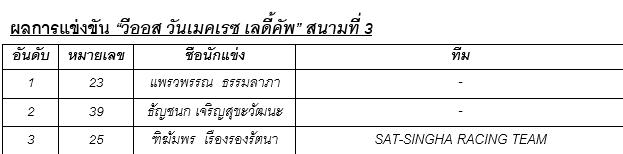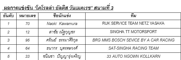 หลังจากสตาร์ทใหม่ “Naoki Kawamura” แชมป์หลายสนามก็ยังโชว์ฟอร์มยอดเยียม นำแบบม้วนเดียวจบ คว้าชัยอย่างขาดลอย โดยมี “สาชัย ณัฐกุญชร” เข้าเส้นชัยเป็นอันดับที่ 2 และ“ศรัณย์ ธรรมาศิริกุล” ที่ชิงเข้าอันดับ 3 ได้เป็นผลสำเร็จ