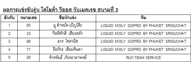 ผลการแข่งขันประจำสนามนี้ “วีออส วันเมคเรซ เลดี้คัพ” แชมป์ตกเป็นของ “แพรวพรรณ ธรรมลาภา” ขณะที่ “มู ฮำหมัด เบ็ญโส๊ะ” โชว์ฟอร์มเยี่ยม คว้าแชมป์ “วีออส วันเมคเรซ” และ “Naoki Kawamura” คว้าแชมป์ “โคโรลล่า อัลติส วันเมคเรซ” ไปครอบครอง