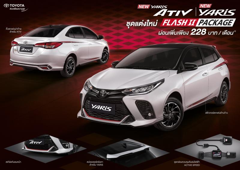 นายสุรศักดิ์ กล่าวเพิ่มเติมว่า“นอกจากนี้ผมขอแนะนำอีกหนึ่งทางเลือกให้กับลูกค้าผู้ชื่นชอบดีไซน์สปอร์ตด้วยชุดตกแต่งพิเศษ FLASH II PACKAGE ที่เสริมความโฉบเฉี่ยวและดูโดดเด่นสะดุดตาให้กับ YARIS และ ATIV มากยิ่งขึ้น และที่สำคัญยังมีกล่องควบคุมคันเร่งไฟฟ้า ACTIVE SPEED เติมความสปอร์ต ตอบสนองรวดเร็วในขณะออกตัว เพิ่มความสนุกสนานในการขับขี่ โดยลูกค้าจ่ายเพิ่มเพียงเดือนละ 228 บาทต่อเดือนในยอดการผ่อนชำระรายเดือนเท่านั้น (คำนวณจากโปรแกรมเช่าซื้อปกติ ATIV รุ่น ENTRY ดาวน์ 25% ระยะเวลา 84 เดือน ผ่านบริษัท โตโยต้า ลีซซิ่ง (ประเทศไทย) จำกัด อ้างอิงดอกเบี้ย ณ เดือนกันยายน 2564)