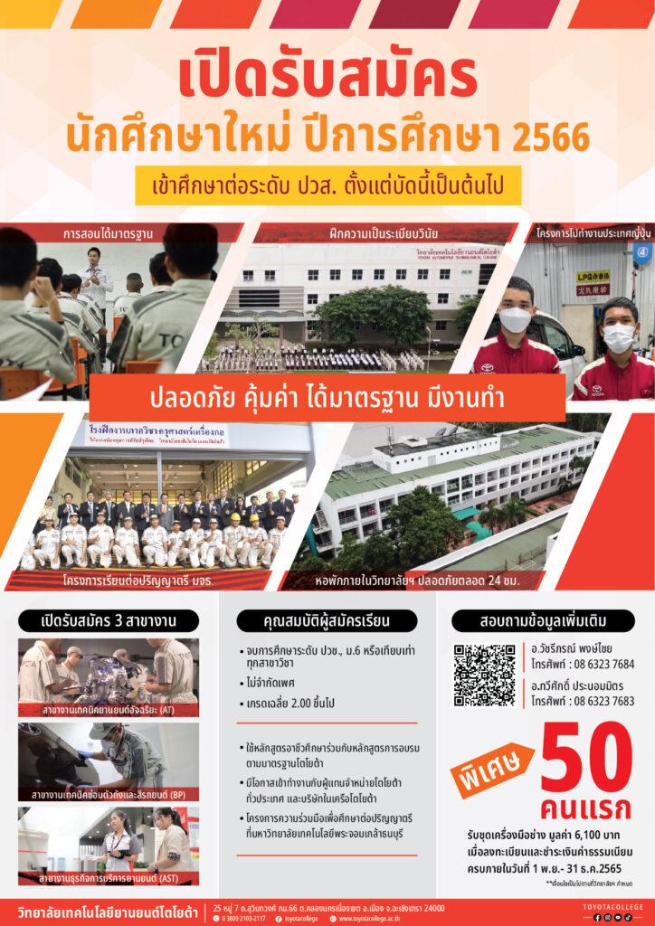 โอกาสดีสำหรับสายอาชีพ วิทยาลัยเทคโนโลยียานยนต์โตโยต้าเปิดรับนักศึกษาใหม่เข้าศึกษาระดับประกาศนียบัตรวิชาชีพชั้นสูง(ปวส)พร้อมโอกาสร่วมงานกับผู้แทนจำหน่ายโตโยต้าทั่วประเทศและทำงานที่ประเทศญี่ปุ่น