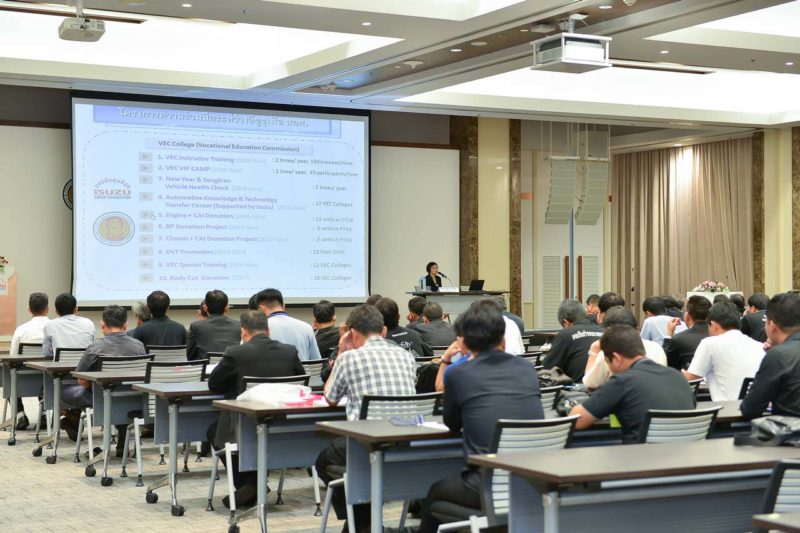 โดยล่าสุดในปีนี้ อีซูซุได้จัดสัมมนาเชิงปฏิบัติการหลักสูตร “เทคโนโลยียานยนต์อีซูซุ” รุ่นที่ 17-18 ซึ่งเป็นการอบรมทั้งในส่วนของภาคทฤษฎี และปฏิบัติอย่างเข้มข้น จากทีมวิทยากรจากสถาบันฝึกอบรมตรีเพชรอีซูซุ (Tri Petch Isuzu Training Academy) โดยได้รับความสนใจจากคณาจารย์ รวมทั้งสิ้น 300 คน จากสถาบันอาชีวศึกษากว่า 150 แห่งทั่วประเทศเข้าร่วมกิจกรรม อีกทั้งยังได้ส่งมอบอุปกรณ์ประกอบการสอนอันทันสมัย ได้แก่