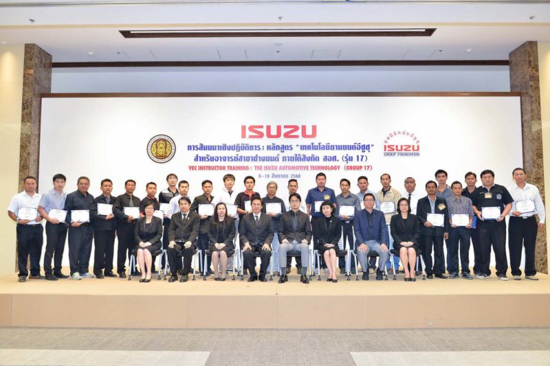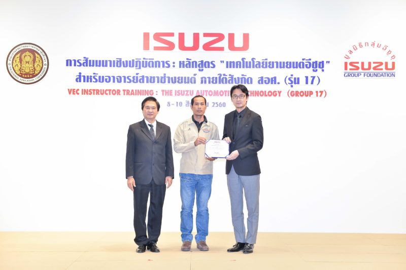 กลุ่มอีซูซุ ร่วมกับ สำนักงานคณะกรรมการการอาชีวศึกษา (สอศ.) สานต่อโครงการพัฒนามาตรฐานบุคลากรสู่ความเป็นเลิศ จัดสัมมนาเชิงปฏิบัติการ หลักสูตร “เทคโนโลยียานยนต์อีซูซุ” รุ่นที่ 17-18 อย่างต่อเนื่อง โดยได้รับเกียรติจาก มร.โทชิอากิ มาเอคาวะ ประธานกรรมการมูลนิธิกลุ่มอีซูซุ และกรรมการผู้จัดการ บริษัท ตรีเพชรอีซูซุเซลส์ จำกัด และ นายวณิชย์ อ่วมศรี รองเลขาธิการคณะกรรมการการอาชีวศึกษา ร่วมพิธีมอบประกาศนียบัตรให้แก่ คณาจารย์จากสถาบันอาชีวศึกษาต่างๆ รวมทั้งสิ้น 300 คน พร้อมทั้งมอบชุดเครื่องยนต์อีซูซุ 1.9 ดีดีไอ บลูเพาเวอร์ และอุปกรณ์เพื่อการส่งเสริมการเรียน-การสอนอันทันสมัย ให้แก่สถานศึกษาที่เข้าร่วมกิจกรรมอีกหลายรายการ