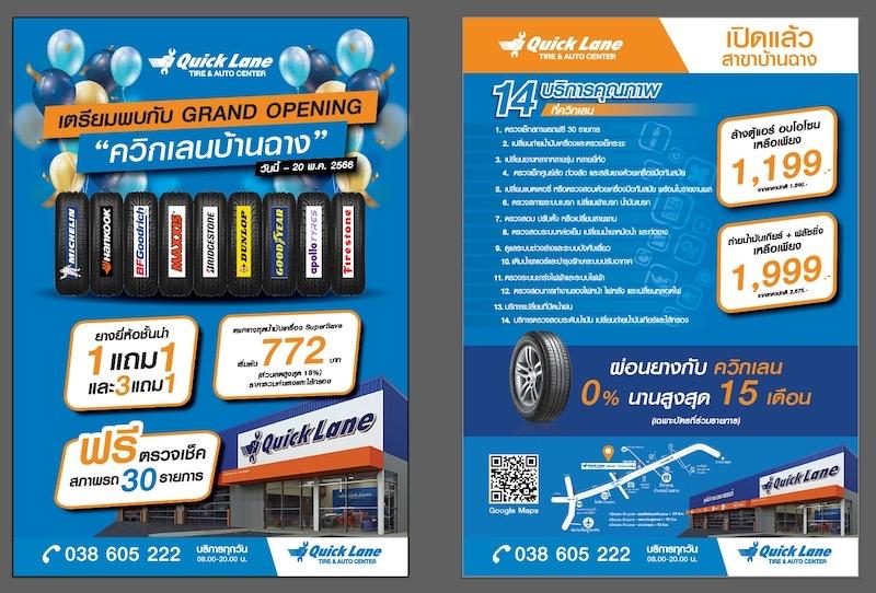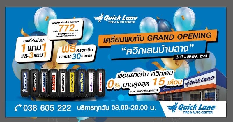 ควิกเลน ยังจัดเต็มมอบโปรโมชั่นพิเศษสุดเร้าใจฉลองเปิดสาขาใหม่ ด้วยโปรโมชั่นยางรถยนต์ยี่ห้อชั้นนำคุณภาพมาตรฐานระดับสากล ได้แก่ โปรโมชั่นซื้อยาง 1 เส้น แถมฟรี 1 เส้น และซื้อยาง 3 เส้น แถมฟรี 1 เส้น ตั้งแต่วันนี้ถึง 20 พ.ค. 2566 เฉพาะลูกค้าสาขาบ้านฉางเท่านั้น