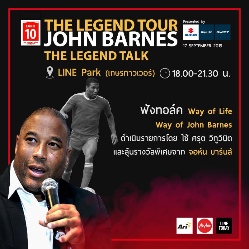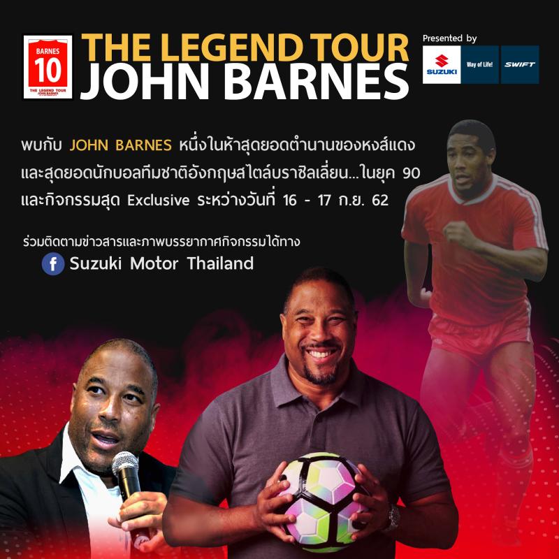 โดยตลอดระยะเวลาการทัวร์เมืองไทยของจอห์น บาร์นส์ จะมีการจัดกิจกรรมต่างๆ ในวันจันทร์ที่ 16 กันยายน 2562 กิจกรรม Legend Visit พบปะกับลูกค้ารถยนต์ซูซูกิที่เป็นแฟนบอลชาวไทย พร้อมด้วยสื่อมวลชนและผู้บริหารของซูซูกิ ที่โชว์รูมผู้จำหน่ายรถยนต์ซูซูกิ บริษัท พีพี เมกะ ออโต้ จำกัด ถนนบางนา-ตราด กม.14 อีกทั้งยังมีกิจกรรม Train with The Legend ฝึกทักษะฟุตบอลร่วมกับตำนานนักเตะจอห์น บาร์นส์ ที่สนามฟุตบอลคริสตัลปาร์ค และวันอังคารที่ 17 กันยายน 2562 กิจกรรม Legend Talk ที่ LINE PARK อาคารเกษรทาวเวอร์ ชมนิทรรศการขนาดย่อม โชว์ประวัติและผลงานของปีกนิลกาฬ จอห์น บาร์นส์ ยอดนักเตะหัวใจของเครื่องจักรสีแดง Red Machine ตำนานนักเตะที่หลายคนให้การยอมรับ ร่วมฟังทอล์ค Way of Life Way of Barnes แบบใกล้ชิดพร้อมเปิดโอกาสให้แฟนบอลถามตอบตรงกับจอห์นบาร์นส์ และพิเศษสุดร่วมลุ้นเป็นผู้โชคดีรับของที่ระลึกและลุ้นเป็นผู้โชคดีได้ Exclusive Meet & Greet ถ่ายรูปขอลายเซ็นอย่างใกล้ชิดกับ จอห์น บาร์นส์ โดยติดตามรายละเอียดการเข้าร่วมกิจกรรมเพิ่มเติมที่ https://www.facebook.com/officialsuzukimotorthailand