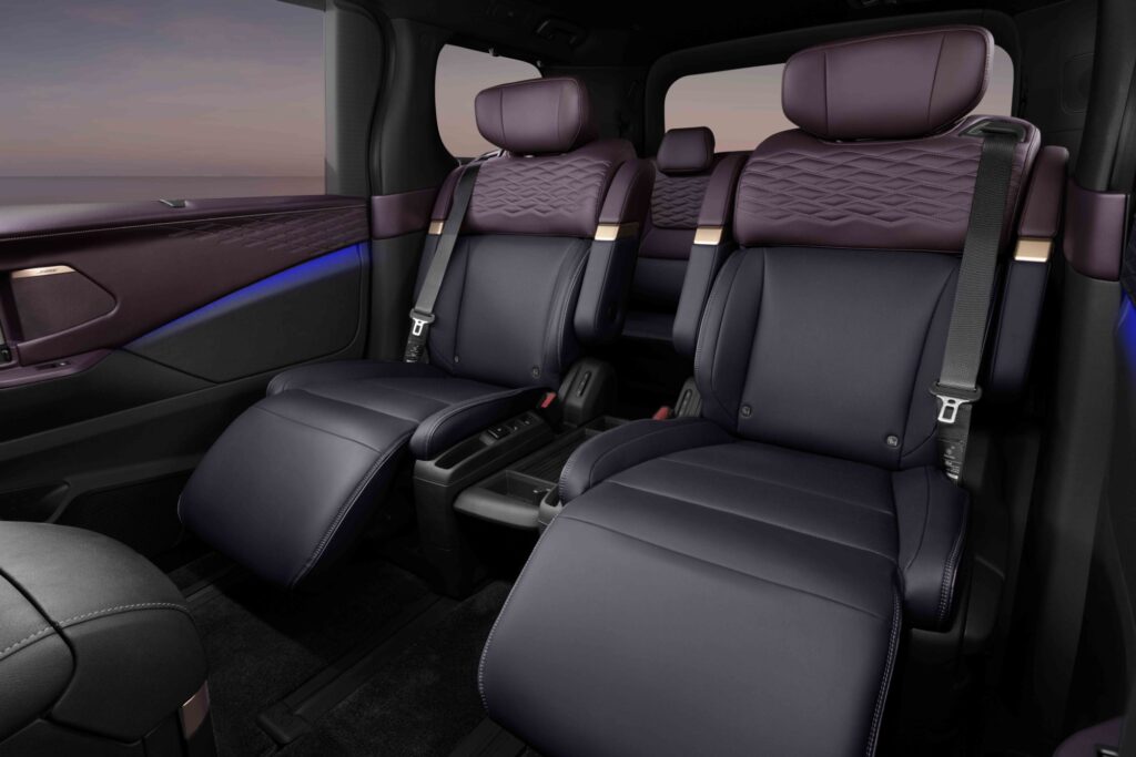 ขณะที่ภายในห้องโดยสารมอบบรรยากาศระดับพรีเมียมแบบเลานจ์ ผู้โดยสารแถวสองจะได้ดื่มด่ำกับความสบายของเบาะ captain seat แบบ zero gravity รวมถึงการใข้ TailorFit™ ซึ่งเป็นวัสดุสังเคราะห์ชนิดใหม่ที่มีความทนทานสูง และให้สัมผัสคล้ายกับหนังแนปปา พร้อมการตกแต่งด้วยหนัง และลายไม้ พร้อมลวดลายที่ได้รับแรงบันดาลใจจากคุมิโกะบนแผงประตู และเบาะนั่ง เสริมความสมบูรณ์แบบด้วยจอแสดงผลคู่ขนาดใหญ่ 14.3 นิ้ว รุ่นแรกในเซกเมนต์ ที่ผสานข้อมูลผู้ขับขี่ และระบบอินโฟเทนเมนต์เข้าด้วยกัน นอกจ่ากนี้ยังเสริมความหรูหราด้วยระบบเสียงระดับพรีเมียมจาก Bose® พร้อมลำโพง 22 ตัว และไฟส่องสว่างภายในห้องโดยสารที่ปรับได้ถึง 64 สี ยกระดับประสบการณ์การเดินทางไปอีกขั้น