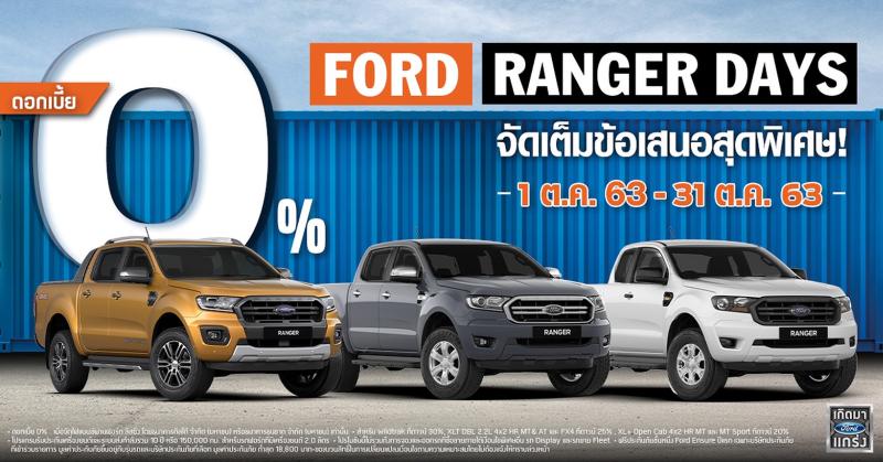 –ฟอร์ด ประเทศไทย เอาใจลูกค้า อัดแคมเปญ ‘Ranger Days’ ต่อเนื่อง จัดเต็มข้อเสนอสุดพิเศษ ด้วยอัตราดอกเบี้ย 0% สำหรับรถยนต์ฟอร์ด เรนเจอร์ รุ่นยอดนิยม ได้แก่ ฟอร์ด เรนเจอร์ ไวลด์แทรค, ฟอร์ด เรนเจอร์ ดับเบิลแค็บ XLT, ฟอร์ด เรนเจอร์ FX4, ฟอร์ด เรนเจอร์ โอเพ่นแค็บ XL+ และฟอร์ด เรนเจอร์ โอเพ่นแค็บ XL+ Sport  เมื่อจองและออกรถ ตั้งแต่ 1 ตุลาคม ถึง 31 ตุลาคม 2563 ที่โชว์รูมฟอร์ดทั่วประเทศ ดังรายละเอียดต่อไปนี้