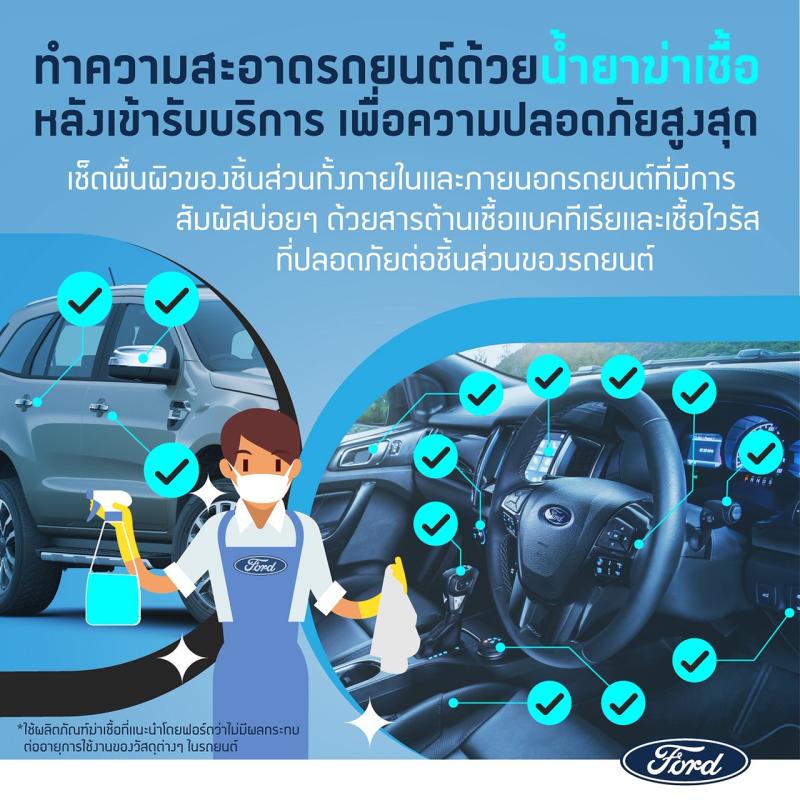 ลูกค้าฟอร์ดสามารถติดต่อศูนย์บริการฟอร์ด เพื่อนัดหมายการเข้ารับบริการ โดยพนักงานของผู้จำหน่าย จะเดินทางไปรับรถยนต์ของลูกค้ามาเข้ารับบริการที่ศูนย์บริการ และส่งมอบรถยนต์คืนถึงบ้าน โดยรถที่เข้ารับบริการทุกคัน จะได้รับบริการทำความสะอาดและฆ่าเชื้อด้วยผลิตภัณฑ์ที่ได้รับการแนะนำโดยฟอร์ดว่าไม่มีผลกระทบต่ออายุการใช้งานของวัสดุต่างๆ ในรถยนต์ฟอร์ดก่อนส่งมอบให้กับลูกค้า