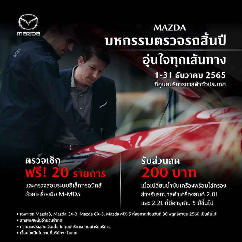 มาสด้า เซลส์ ประเทศไทย ส่งความห่วงใยไปยังลูกค้าและผู้ใช้รถใช้ถนนผ่านแคมเปญ MAZDA มหกรรมตรวจรถสิ้นปี อุ่นใจทุกเส้นทาง เชิญลูกค้ามาสด้าเข้ารับการตรวจเช็กสภาพรถฟรีทุกรุ่น รวม 20 รายการ พร้อมตรวจเช็กระบบอิเล็กทรอนิกส์ด้วยเครื่องมือพิเศษ M-MDS ก่อนเดินทางในช่วงวันหยุดยาวกับเทศกาลปีใหม่ เพื่อให้รถอยู่ในสภาพสมบูรณ์พร้อมใช้งานได้อย่างปลอดภัย และรับส่วนลดพิเศษเพิ่มเติมอีก 200 บาท* เมื่อเปลี่ยนถ่ายน้ำมันเครื่องพร้อมไส้กรอง สำหรับรถยนต์มาสด้าเครื่องยนต์สกายแอคทีฟเบนซิน 2.0 ลิตร และเครื่องยนต์สกายแอคทีฟคลีนดีเซล 2.2 ลิตร ที่มีอายุเกิน 5 ปี ขึ้นไป โดยสามารถติดต่อสอบถามและนัดหมายเข้ารับบริการได้ตั้งแต่วันที่ 1-31 ธันวาคม 2565 ที่ศูนย์บริการมาสด้าทั่วประเทศ
