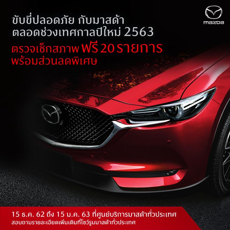 มาสด้าร่วมกับผู้จำหน่ายมาสด้าทั่วประเทศผุดโครงการ “ตรวจรถฟรี ขับขี่ปลอดภัย เทศกาลปีใหม่ 2563” สนับสนุนให้การเกิดอุบัติเหตุเป็นศูนย์ตลอดช่วงเวลาแห่งการเฉลิมฉลองเทศกาลปีใหม่ของทุกครอบครัว เชิญชวนลูกค้านำรถเข้าตรวจเช็คสภาพรถฟรี 20 รายการ ตามมาตรฐานกรมการขนส่งทางบก อีกทั้งยังมอบส่วนลดค่าอะไหล่ และค่าแรง 10% ในสินค้าที่ร่วมรายการ ตั้งแต่วันที่ 15 ธันวาคม 2562 – 15 มกราคม 2563 ณ ศูนย์บริการมาสด้าทั่วประเทศ