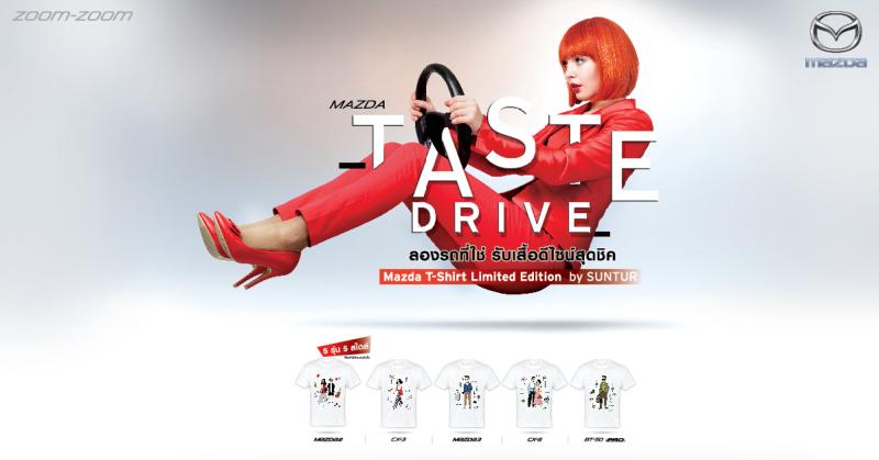 นอกจากนี้มาสด้ายังเชิญชวนลูกค้ามาร่วมทดลองขับรถมาสด้าในรุ่นที่ชื่นชอบกับกิจกรรม MAZDA TASTE DRIVE ไม่ว่าจะเป็นรุ่น มาสด้า2, มาสด้า3, มาสด้า ซีเอ็กซ์-3, มาสด้า ซีเอ็กซ์-5 และมาสด้า บีที-50 โปร เพียงลงทะเบียนเพื่อทดลองขับรถมาสด้าที่โชว์รูมผ่าน www.mazdatastedrive.com โดยระบุรุ่น และโชว์รูมที่ต้องการ หลังจากร่วมทดลองขับขี่ตามรุ่น และสถานที่ที่ระบุเรียบร้อยแล้ว รับเสื้อ Mazda T-Shirt Limited Edition by SUNTUR ศิลปินวาดภาพ และออกแบบชื่อดัง “ซันเต๋อ” หรือ “ยศนันท์ วุฒิกรสมบัติกุล” นักสร้างสรรค์ผลงานชื่อดังในโลกออนไลน์ทั้งเฟสบุ๊ค และอินสตาแกรม โดยเสื้อมีด้วยกัน 5 แบบ 5 สไตล์ ที่จะบ่งบอกความเป็นตัวตนลูกค้าของรถทั้ง 5 รุ่น ทางมาสด้าจะจัดส่งให้ถึงบ้าน