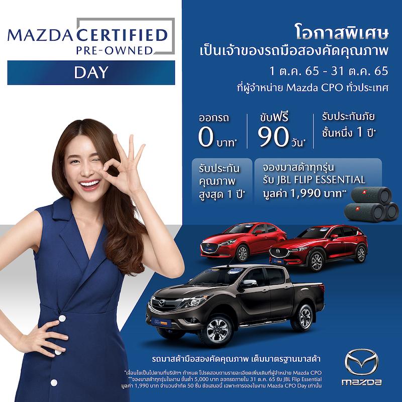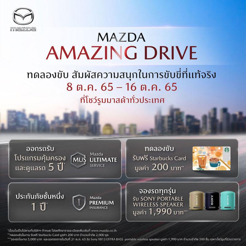 พร้อมกันนี้ในเดือนตุลาคม มาสด้ายังได้มอบข้อเสนอสุดพิเศษให้กับลูกค้าที่ต้องการออกรถใหม่ด้วยกิจกรรมสุดพิเศษ Mazda Amazing Drive ทดลองขับสัมผัสความสนุกในการขับขี่ที่แท้จริง ระหว่างวันที่ 8 – 16 ตุลาคม 2565 ที่โชว์รูมมาสด้าทั่วประเทศ ทดลองขับรถยนต์มาสด้าทุกรุ่น รับฟรี Starbucks Card มูลค่า 200 บาท* และเมื่อออกรถ รับฟรี Mazda Ultimate Service (MUS) หรือ โปรแกรมคุ้มครองและดูแลรถ 5 ปี* ฟรีประกันภัยชั้นหนึ่ง Mazda Premium Insurance (MPI) 1 ปี* และลำโพง Sony Portable Wireless Speaker มูลค่า 1,990 บาท* นอกจากนี้ มาสด้ายังเปิดโอกาสให้ลูกค้าได้เป็นเจ้าของรถยนต์มือสองคัดคุณภาพ ในงาน Mazda Certified Pre-Owned Day พบกับข้อเสนอ ออกรถ 0 บาท** ขับฟรี 90 วัน** รับประกันภัยชั้นหนึ่ง 1 ปี** รับประกันคุณภาพสูงสุด 1 ปี** และจองมาสด้าทุกรุ่นรับ JBL Flip Essential มูลค่า 1,990 บาท** ระหว่างวันที่ 1-31 ต.ค. 65 ที่ผู้จำหน่าย Mazda CPO ทั่วประเทศ