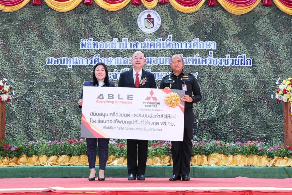 บริษัท มิตซูบิชิ มอเตอร์ส (ประเทศไทย) จำกัด ร่วมกับ บริษัท เอเบิล มอเตอร์ส ปากเกร็ด จำกัด เดินหน้าเสริมศักยภาพทักษะเชิงช่างในสายอาชีพอย่างต่อเนื่อง ด้วยการมอบเครื่องยนต์และระบบส่งกำลัง ให้แก่ โรงเรียนกองทัพบกอุปถัมภ์ ช่างกล ขส.ทบ. โดยภายในพิธีมี การลงนามบันทึกข้อตกลงความร่วมมือ (MOU) ระหว่างบริษัท เอเบิล มอเตอร์ส ปากเกร็ด จำกัด และ โรงเรียนกองทัพบกอุปถัมภ์ ช่างกล ขส.ทบ. โดยเป็น การบันทึกข้อตกลงความร่วมมือทางวิชาการ ผ่านการจัดการเรียนการสอนหลักสูตรประกาศนียบัตรวิชาชีพ สาขาวิชาช่างยนต์ สาขาวิชา