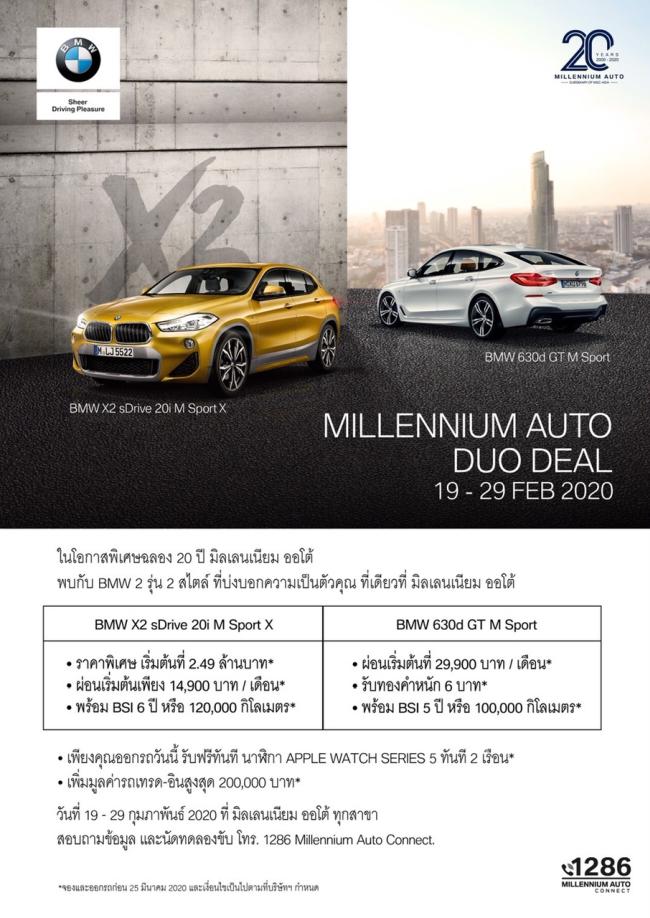 บริษัท มิลเลนเนียม ออโต้ กรุ๊ป จำกัด หนึ่งในผู้จำหน่ายรถยนต์ บีเอ็มดับเบิลยู, มินิ และมอเตอร์ไซค์ บีเอ็มดับเบิลยู มอเตอร์ราด ภายใต้กลุ่มธุรกิจ มาสเตอร์ กรุ๊ป คอร์ปอเรชั่น (เอเขีย) เปิดศักราชครบรอบ 20 ปี คว้าสิทธิการจำหน่ายแบบเอ็กซ์คลูซีฟ จัดเต็มรถยนต์ บีเอ็มดับเบิลยู ประกอบนอก รุ่น X2 sDrive 20i M Sport X และ 630d GT M Sport จัดกิจกรรมพิเศษวันที่ 20 กุมภาพันธ์ เฉพาะที่โชว์รูม มิลเลนเนียม ออโต้ พระราม 4 สำหรับลูกค้า มิลเลนเนียม ออโต้