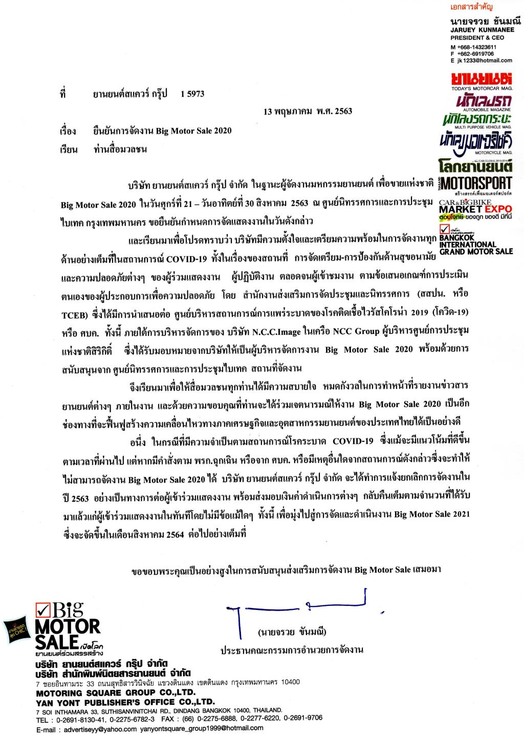 ยืนยันการจัดงาน Big Motor Sale 2020 14 May 2020 Thunyaluk Seniwongs ยืนยันการจัดงาน Big Motor Sale 2020 21 – 30 สิงหาคม 2563 @ไบเทค บางนา tagged with BigMotorSale2020, featured, มหกรรมยานยนต์เพื่อขายแห่งชาติ2019, ยืนยันการจัดงานBigMotorSale2020 ข่าวประชาสัมพันธ์
