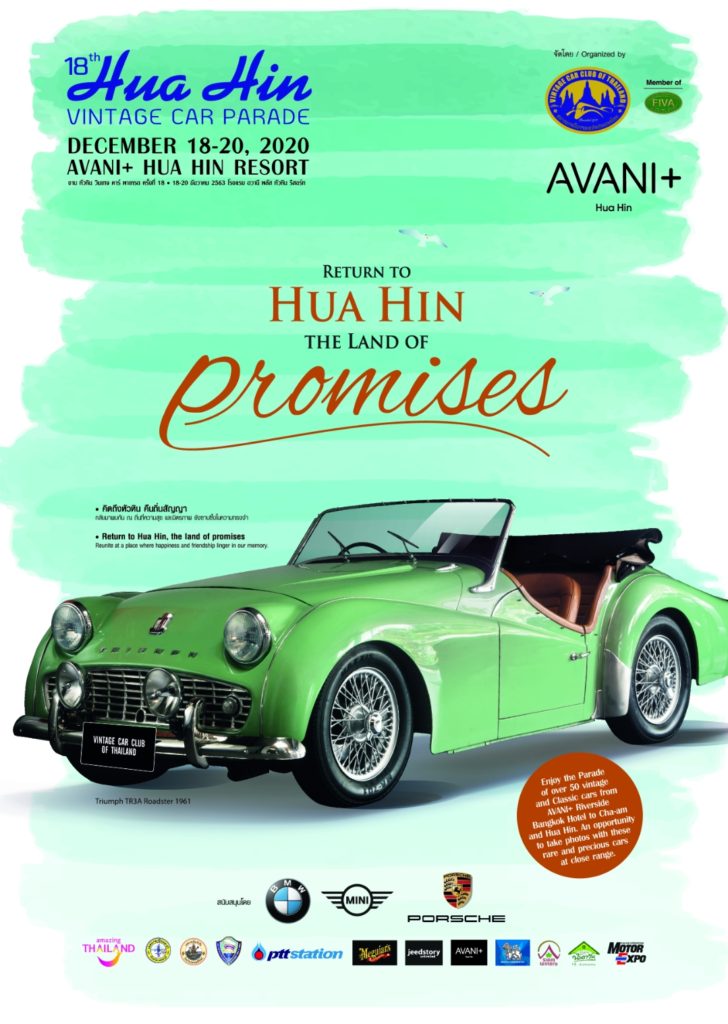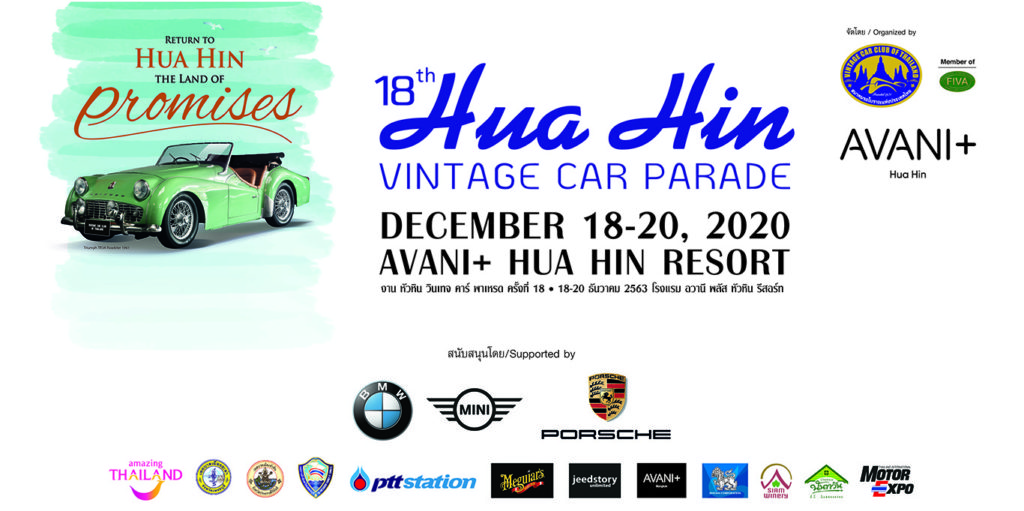 สมาคมรถโบราณแห่งประเทศไทย โรงแรมอวานี พลัส ริเวอร์ไซด์ กรุงเทพฯ โรงแรมอวานี พลัส หัวหิน รีสอร์ท เทศบาลเมืองชะอํา เทศบาลเมืองหัวหิน และ ททท. ร่วมกันจัดงานหัวหิน วินเทจคาร์ พาเหรด ครั้งที่ 18” ตามแนวคิด คิดถึงหัวหิน คืนถิ่นสัญญา” วันที่ 18 – 20 ธันวาคม นี้