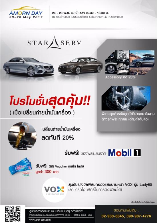 ส่วนบริษัท อมรแคร์ จำกัด ( StarServ) ศูนย์ซ่อมบำรุงรถยนต์ เมอร์เซเดส-เบนซ์ และบีเอ็มดับเบิลยู ที่หมดระยะเวลารับประกัน โดยมอบสิทธิพิเศษสำหรับลูกค้าที่นำรถยนต์มาเปลี่ยนถ่ายน้ำมันเครื่องในวันงาน”อมรเดย์” จะได้รับส่วนลด 20% ,บริการล้างรถฟรี, และของพรีเมี่ยมจาก Mobill1 Center สุดพิเศษ อุปกรณ์ยกรถด้วยระบบไฟฟ้า Mobile Hoist จากประเทศเยอรมนี ลดสูงสุด 50%