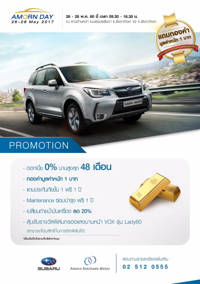 ด้านบริษัท อมรรัชดา มอเตอร์ จำกัด ผู้แทนจำหน่ายรถยนต์ ซูบารุ มอบสิทธิพิเศษอย่างเหนือระดับ ให้กับลูกค้าที่ซื้อรถยนต์ ซูบารุ ทุกรุ่น จะได้รับสร้อยคอทองคำหนัก 1 บาท พร้อมข้อเสนอสุดพิเศษ ดอกเบี้ย 0% ผ่อนนานสูงสุด 48 เดือน พร้อมประกันชั้น 1 นาน 1 ปี ฟรีค่าบำรุงรักษานาน 1 ปี ขณะที่ บริษัท อมรรัชดา 1699 จำกัด ผู้แทนจำหน่ายรถจักรยานยนต์ “เวสป้า” รับของแถมฟรี 12 รายการ อาทิ ฟรีค่าจดทะเบียน ,ค่าพรบ ,ประกันรถยนต์ ฯลฯ มูลค่ากว่า 8,000 บาท สำหรับลูกค้าทุกท่านที่ซื้อรถจักรยานยนต์เวสป้าภายในงาน