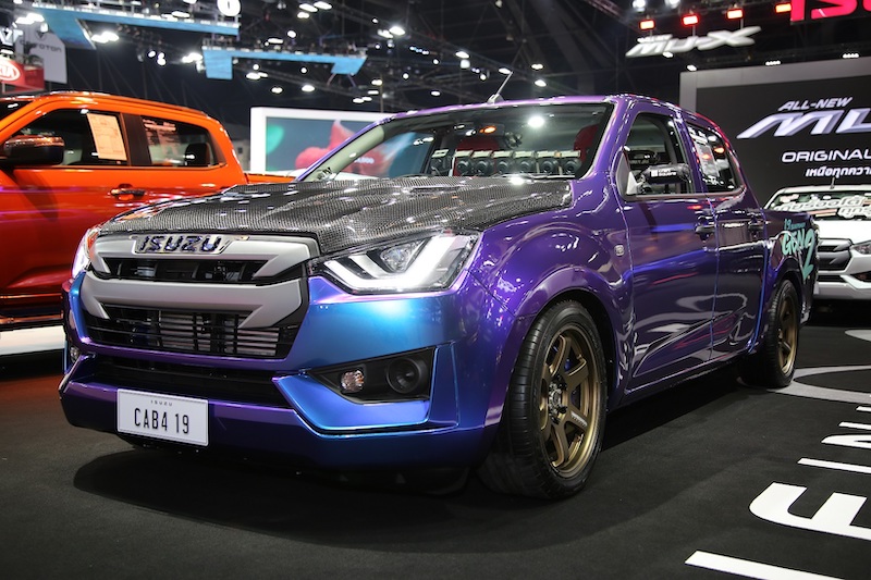 - “อีซูซุดีแมคซ์ แค็บโฟร์ เอส” ปิกอัพแต่งซิ่งพิเศษสะกดทุกสายตาด้วยสติกเกอร์แร๊พพิเศษสีม่วงสะดุดตา จัดทรงด้วยชุดแต่งรอบคันสะท้อนบุคลิกที่โฉบเฉี่ยว เต็มอารมณ์สปอร์ตกับฝากระโปรงหน้า ฝาปิดกระบะท้ายและสปอยเลอร์ท้ายสีเทาดำสุดเข้มแบบ Carbon Composite จาก Monza น้ำหนักเบา ชุดไฟหน้าแบบ ISUZU Bi-LED พร้อม Daytime Running Light ชุดโหลดช่วงล่างปรับระดับได้ Aztex Force ล้ออัลลอย Rays Volk Racing TE37SB ขนาด 18 นิ้ว พร้อมยาง Toyo Tires Proxes T1-S Sport ขนาด 245/45 R18 เบรกได้มั่นใจสุดด้วยชุดดิสก์เบรกหน้าแบบ 6 Pot และหลังแบบ 4 Pot จาก Endless ปรับจูนความแรงเครื่องยนต์ด้วยกล่องพ่วง Alpha Tech รุ่น Super Storm ให้กำลังสูงสุด 350 แรงม้า แรงบิดสูงสุด 600 นิวตัน-เมตร คลัทช์ BRC Full Plateชุดอินเตอร์คูลเลอร์และท่อไอเสียพร้อมตกแต่งห้องเครื่องยนต์สไตล์สปอร์ตโดย BRD Racing Shop เบาะคู่หน้าแบบบัคเก็ตซีท H-Drive เข้ากับชุดเข็มขัดนิรภัยแบบ 6 จุด Simpson พวงมาลัย Nardi พร้อมคอแบบพับได้ ผสานชุดแต่งตามแบบฉบับวัยรุ่นนิยมด้วย Iron Bar ทั้งภายนอกและภายในรวมมูลค่าชุดแต่งกว่า800,000 บาท