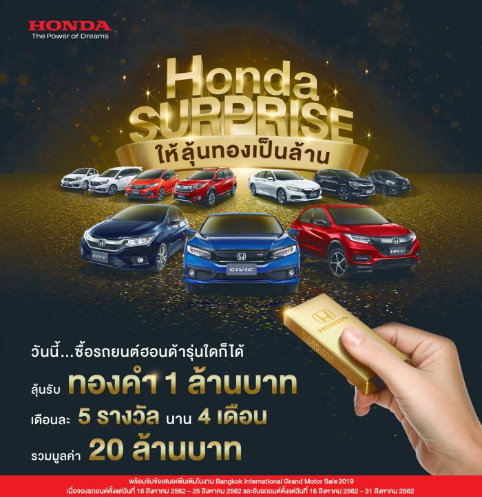 • แคมเปญ “Honda Surprise ให้ลุ้นทองเป็นล้าน” สำหรับลูกค้าที่ซื้อและรับรถยนต์ฮอนด้ารุ่นใดก็ได้ ตั้งแต่วันที่ 1 กรกฎาคม 2562 – 31 ตุลาคม 2562 จะได้รับ 1 สิทธิ์ เพื่อลุ้นรับทองคำรูปพรรณมูลค่า