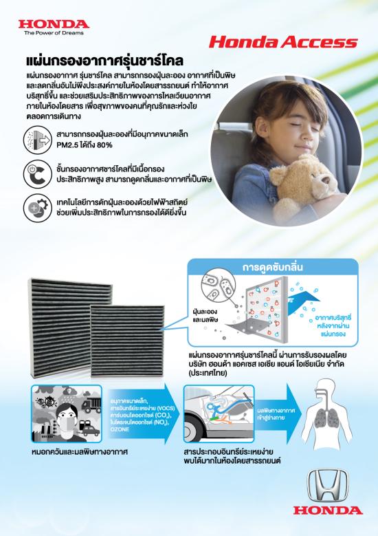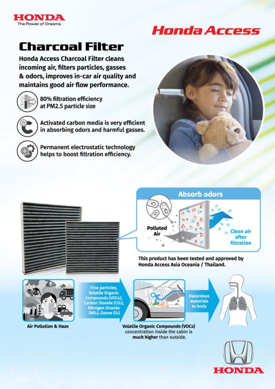 เรายังตระหนักถึงปัญหาฝุ่นละอองขนาดเล็ก PM 2.5 ที่ส่งผลกระทบโดยตรงต่อสุขภาพ จึงอยากเชิญชวนให้ลูกค้าฮอนด้านำรถยนต์เข้ารับบริการล้างทำความสะอาดระบบแอร์ พร้อมรับส่วนลดสำหรับแผ่นกรองอากาศรุ่นชาร์โคล (Charcoal) ที่สามารถกรองหมอกควันและมลพิษทางอากาศ โดยเฉพาะฝุ่น PM 2.5 และยังช่วยเสริมประสิทธิภาพของการไหลเวียนอากาศในห้องโดยสาร เพื่อสุขภาพที่ดีของลูกค้าฮอนด้าในทุกการเดินทางอีกด้วย”