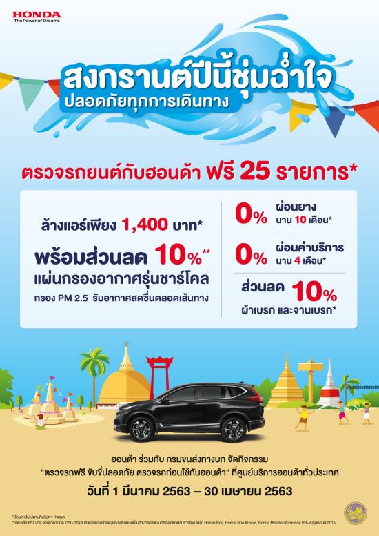 บริษัท ฮอนด้า ออโตโมบิล (ประเทศไทย) จำกัด ร่วมกับกรมการขนส่งทางบก จัดแคมเปญ “ตรวจรถฟรี ขับขี่ปลอดภัย ตรวจรถก่อนใช้กับฮอนด้า” เพื่อเตรียมความพร้อมและสร้างความมั่นใจทุกการเดินทางในช่วงเทศกาลสงกรานต์ โดยเชิญชวนลูกค้าเข้ารับบริการตรวจเช็กสภาพรถยนต์ฟรี 25 รายการ พร้อมด้วยส่วนลดอะไหล่ การผ่อนชำระค่าใช้จ่ายงานบริการ 0% นาน 4 เดือน และการผ่อนชำระค่าใช้จ่ายยางรถยนต์ 0% นาน 10 เดือน และข้อเสนอพิเศษแทนความห่วงใย เมื่อลูกค้านำรถยนต์เข้ารับบริการล้างทำความสะอาดระบบแอร์ (Evaporator cleaner) ในราคาเพียง 1,400 บาท จะได้รับส่วนลด 10% สำหรับแผ่นกรองอากาศรุ่นชาร์โคล (Charcoal) ที่สามารถกรองฝุ่นละออง โดยเฉพาะฝุ่น PM 2.5 โดยลูกค้าสามารถนำรถยนต์เข้ารับการบริการได้ที่ศูนย์บริการฮอนด้าทั่วประเทศ ตั้งแต่วันที่ 1 มีนาคม 2563 – 30 เมษายน 2563