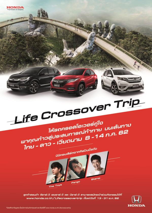 กิจกรรม “Life Crossover Trip” จัดขึ้นเพื่อขอบคุณลูกค้ารถยนต์เอสยูวีของฮอนด้าทั่วประเทศที่มีหลากหลายกลุ่ม ทั้งกลุ่มครอบครัว กลุ่มเพื่อน และกลุ่มที่ต้องการการใช้งานที่ลงตัว ได้ร่วมเปิดประสบการณ์ท่องเที่ยวแบบใหม่ที่ฉีกออกไปจากกรอบเดิมๆ พร้อมพิสูจน์สมรรถนะที่แข็งแกร่งและความอเนกประสงค์ที่เหนือระดับของยนตรกรรมฮอนด้า โดยขบวนกิจกรรมจะออกเดินทางจากกรุงเทพฯ มุ่งหน้าสู่ภาคตะวันออกเฉียงเหนือของไทย ก่อนข้ามพรมแดนเข้าเขตประเทศลาวและเวียดนาม โดยคณะกิจกรรมจะเดินทางผ่านสถานที่ท่องเที่ยวที่น่าสนใจหลายที่ไม่ว่าจะเป็น จังหวัดมุกดาหารและอุบลราชธานีของไทย เมืองดองฮอย ดานัง บานา ฮิลล์ และฮอยอันของเวียดนาม รวมไปถึงปากเซและปากซองของลาว รวมระยะทางกว่า 2,562 กิโลเมตร ตลอด 7 วัน สำหรับความพิเศษของ “Life Crossover Trip” ในครั้งนี้ นอกเหนือจากการขับขี่อย่างสนุกสุดท้าทายใน 3 ประเทศแล้ว ยังมีอีกหนึ่งไฮไลท์คือ ผู้ร่วมทริปทุกคนจะได้ใกล้ชิดกับศิลปินชื่อดัง นำโดยศิลปินมากความสามารถอย่าง “เดอะ ทอยส์ (The Toys)” “แป้งโกะ จินตนัดดา” และ “แสตมป์ อภิวัชร์” ที่จะมาถ่ายทอดบทเพลงเพราะๆ และสร้างรอยยิ้มท่ามกลางบรรยากาศเมืองเทพนิยายบนยอดเขาประเทศเวียดนาม