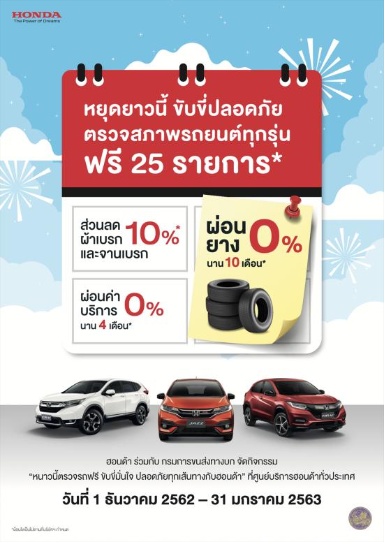 บริษัท ฮอนด้า ออโตโมบิล (ประเทศไทย) จำกัด ร่วมกับกรมการขนส่งทางบก จัดแคมเปญบริการต้อนรับปีใหม่ 2563 “หนาวนี้ ตรวจรถฟรี ขับขี่มั่นใจ ปลอดภัยทุกเส้นทางกับฮอนด้า” เชิญชวนลูกค้าฮอนด้าเตรียมความพร้อมก่อนการเดินทางในช่วงเทศกาลปีใหม่ ด้วยบริการตรวจสภาพรถยนต์ฟรี 25 รายการ พร้อมด้วยส่วนลดอะไหล่ การผ่อนชำระค่าใช้จ่ายงานบริการ 0% นาน 4 เดือน และพิเศษกับการผ่อนชำระค่าใช้จ่ายยางรถยนต์ 0% นานสูงสุด 10 เดือน โดยลูกค้าสามารถนำรถยนต์เข้ารับการบริการที่ศูนย์บริการฮอนด้าทั่วประเทศ ตั้งแต่วันที่ 1 ธันวาคม 2562 – 31 มกราคม 2563