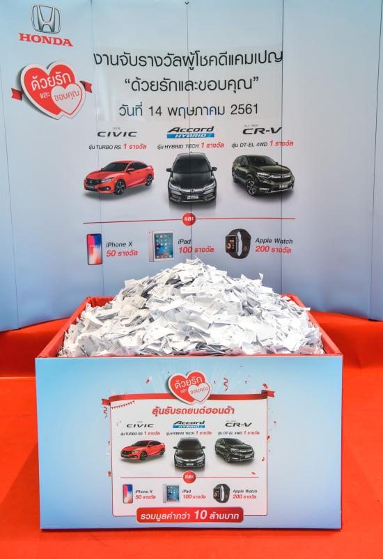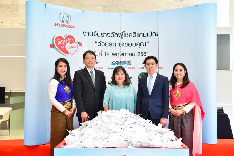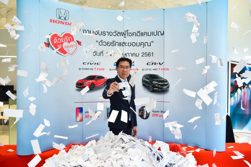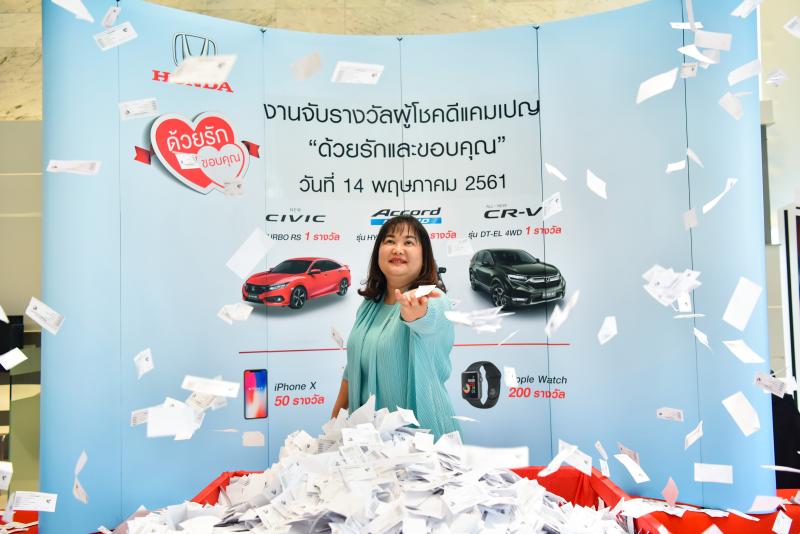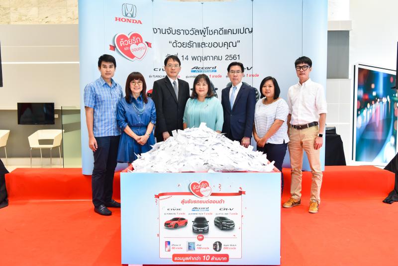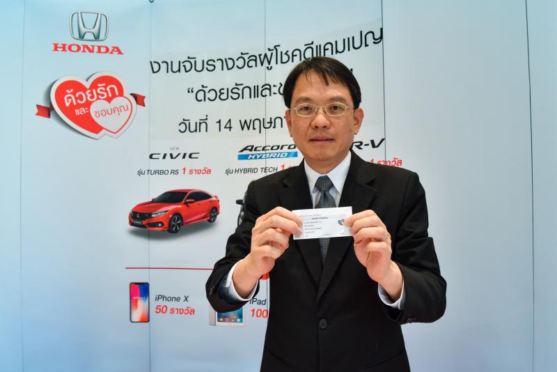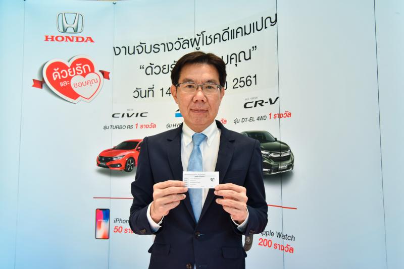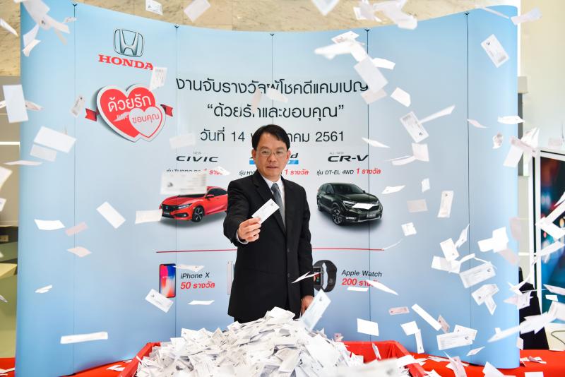 บริษัท ฮอนด้า ออโตโมบิล (ประเทศไทย) จำกัด ประกาศรายชื่อผู้โชคดี จากแคมเปญ “ฮอนด้า ด้วยรักและขอบคุณ” ที่ฮอนด้าได้จัดขึ้นเพื่อส่งมอบความสุขให้แก่ลูกค้าที่จองรถยนต์ฮอนด้าทุกรุ่นตั้งแต่วันที่ 1 ก.พ. – 10 เม.ย. 2561 และรับรถภายในวันที่ 30 เม.ย. 2561 เพื่อแทนคำขอบคุณในความไว้วางใจตลอดระยะเวลาที่ผ่านมา จนทำให้ฮอนด้ามียอดจำหน่ายรถยนต์สูงเป็นอันดับหนึ่งในตลาดรถยนต์นั่งส่วนบุคคลถึง3 ปีซ้อน โดยรางวัลใหญ่ ได้แก่ รถยนต์ฮอนด้า แอคคอร์ด ไฮบริด รุ่น HYBRID TECH รถยนต์ฮอนด้า ซีอาร์-วีรุ่น DT-EL 4WD และรถยนต์ฮอนด้า ซีวิค รุ่น TURBO RS พร้อมรางวัลอื่นๆ รวม 353 รางวัล มูลค่ารวมทั้งสิ้น 10,950,000 บาท