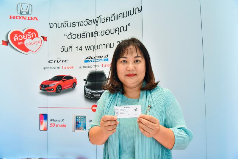 จับรางวัลโดยนางพิศสมร นิภาวงษ์ ผู้จัดการทั่วไปส่วนงานขาย บริษัท ฮอนด้า ออโตโมบิล (ประเทศไทย) จำกัด