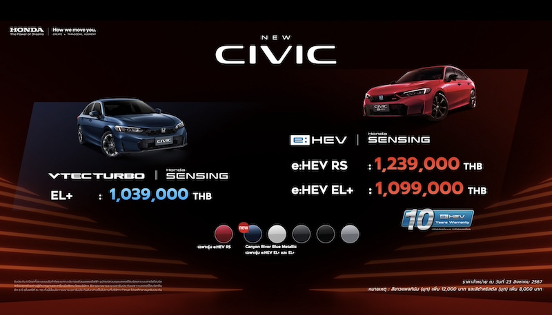 23 สิงหาคม 2567 บริษัท ฮอนด้า ออโตโมบิล (ประเทศไทย) จำกัด ประกาศราคาจำหน่ายอย่างเป็นทางการของ ฮอนด้า ซีวิค ใหม่ ไอคอนยนตรกรรมสปอร์ตพรีเมียมซีดานของฮอนด้า ยกระดับความคุ้มค่าด้วยราคาใหม่ ทั้งระบบขับเคลื่อนฟูลไฮบริด e:HEV รุ่น e:HEV EL+ ราคา 1,099,000 และรุ่น e:HEV RS ราคา 1,239,000 บาท และขุมพลังเทอร์โบ รุ่น EL+  ราคา 1,039,000 บาท  พร้อมให้คุณเป็นเจ้าของได้ง่ายยิ่งขึ้น