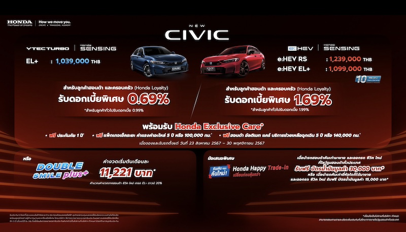(คำนวณจาก ซีวิค ใหม่ เกรด EL+ เงื่อนไขดาวน์ 20% ผ่อน 5 ปี) หรือเลือกดาวน์ต่ำเพียง 10% และพิเศษกับแคมเปญ “Honda Happy Trade-in” เมื่อนำรถฮอนด้าคันเก่ามาขายและออกรถ ซีวิค ใหม่ ที่โชว์รูมฮอนด้าทั่วประเทศ รับเพิ่ม บัตรน้ำมันมูลค่า 30,000 บาท* หรือเมื่อนำรถยนต์คันเดิมยี่ห้อใดก็ได้มาขายและออกรถ ซีวิค ใหม่ ที่โชว์รูมฮอนด้าทั่วประเทศ รับเพิ่ม บัตรน้ำมันมูลค่า 15,000 บาท* ตั้งแต่วันที่ 23 สิงหาคม 2567