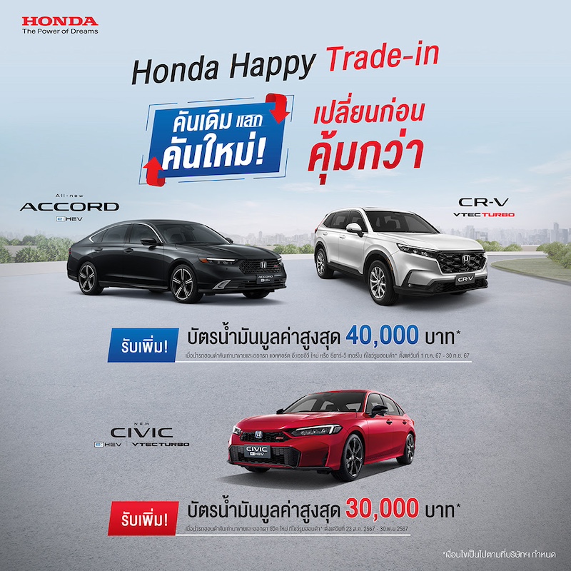 ไม่จำกัดระยะทาง และพิเศษกับแคมเปญ “Honda Happy Trade-in” เมื่อนำรถยนต์ฮอนด้าคันเก่ามาขายและออกรถ แอคคอร์ด อี:เอชอีวี ใหม่ ที่โชว์รูมฮอนด้า รับเพิ่ม บัตรน้ำมันมูลค่า 40,000 บาท หรือเมื่อนำรถยนต์คันเดิมยี่ห้อใดก็ได้มาขายและออกรถ แอคคอร์ด อี:เอชอีวี ใหม่ ที่โชว์รูมฮอนด้า รับเพิ่ม บัตรน้ำมันมูลค่า 20,000 บาท
