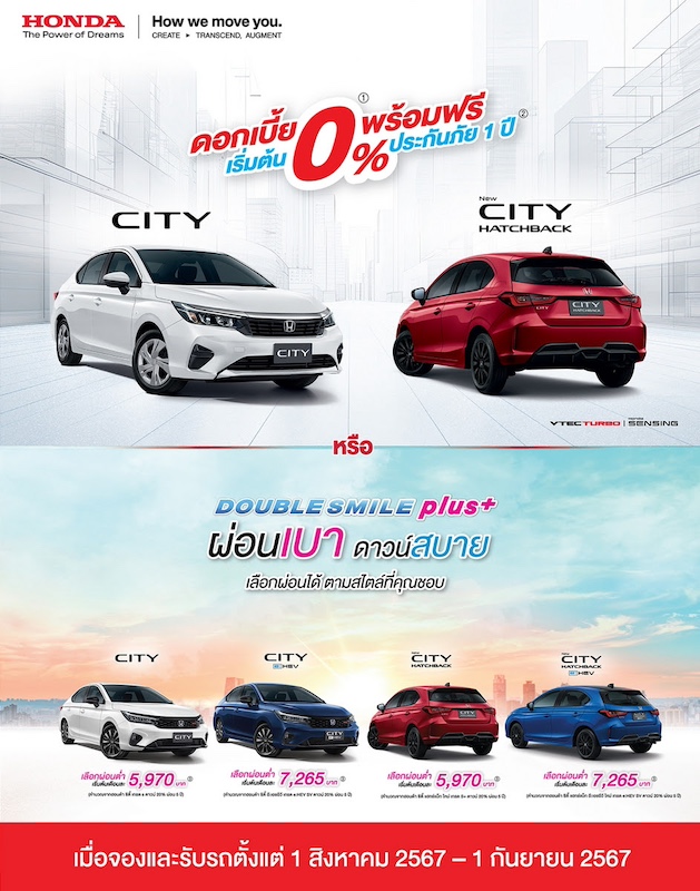 พิเศษสุด! เฉพาะฮอนด้า ซิตี้ เทอร์โบ และ ฮอนด้า ซิตี้ แฮทช์แบ็ก เทอร์โบ ใหม่ เมื่อใช้สินเชื่อดับเบิ้ล สไมล์ พลัส โดยเลือกผ่อนชำระแบบ 5 ปี รับสิทธิพิเศษฮอนด้าช่วยผ่อนเดือนละ 1,200 บาท เป็นเวลา 60 เดือน รวมมูลค่า 72,000 บาท ค่างวดเริ่มต้นเพียง 4,770 บาท (คำนวณจาก ซิตี้ เทอร์โบ เกรด S และ ซิตี้ แฮทช์แบ็ก เทอร์โบ ใหม่ เกรด S+ เงื่อนไขดาวน์ 20% ผ่อน 5 ปี ซึ่งหัก