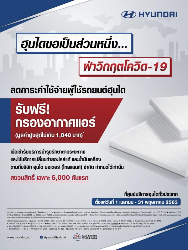 – แคมเปญพิเศษ ลดภาระช่วงวิกฤต Covid-19 ฮุนไดขอเป็นส่วนหนึ่งในการช่วยแบ่งเบาภาระค่าใช้จ่าย ในช่วงสถานการณ์ที่ทุกคนต่างได้รับผลกระทบจากภัยโรคระบาดครั้งนี้ โดยมอบสิทธิพิเศษให้ลูกค้าสามารถผ่อนชำระค่าใช้จ่ายดอกเบี้ย 0% นานสูงสุด 4 เดือนสำหรับค่าอะไหล่และค่าบริการ ตามเงื่อนไขธนาคาร นอกจากนี้ พิเศษสำหรับลูกค้าที่เข้ารับบริการบำรุงรักษาตามระยะทาง และใช้บริการเปลี่ยนถ่ายอะไหล่แท้ และ น้ำมันเครื่อง ช่วงระหว่างวันที่ 1 เมษายน – 31 พฤษภาคมนี้ รับฟรี กรองอากาศแอร์ (มูลค่าสูงสุดไม่เกิน 1,840 บาท/ สงวนสิทธิ์เฉพาะ 6,000 คันแรก)