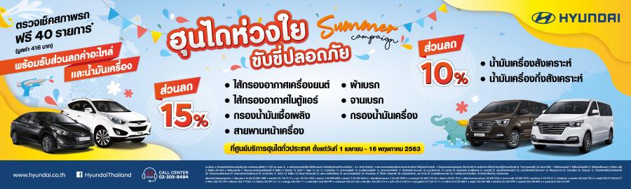บริษัท ฮุนได มอเตอร์ (ไทยแลนด์) จำกัด จัดซัมเมอร์ แคมเปญ “ฮุนไดห่วงใย ขับขี่ปลอดภัย” เพื่อให้รถยนต์ของท่านอยู่ในสภาพพร้อมใช้งานในทุกสถานการณ์ เชิญชวนลูกค้านำรถยนต์ฮุนไดทุกรุ่นเข้ารับบริการตรวจเช็คสภาพรถยนต์ฟรี 40 รายการ พร้อมข้อเสนอพิเศษ ดังนี้