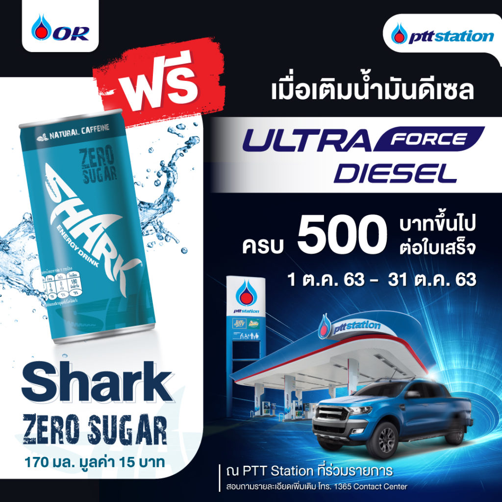 เติมน้ำมันอัลตร้าฟอร์ซ ดีเซล รับฟรี Shark Zero Sugar ที่ พีทีที สเตชั่น