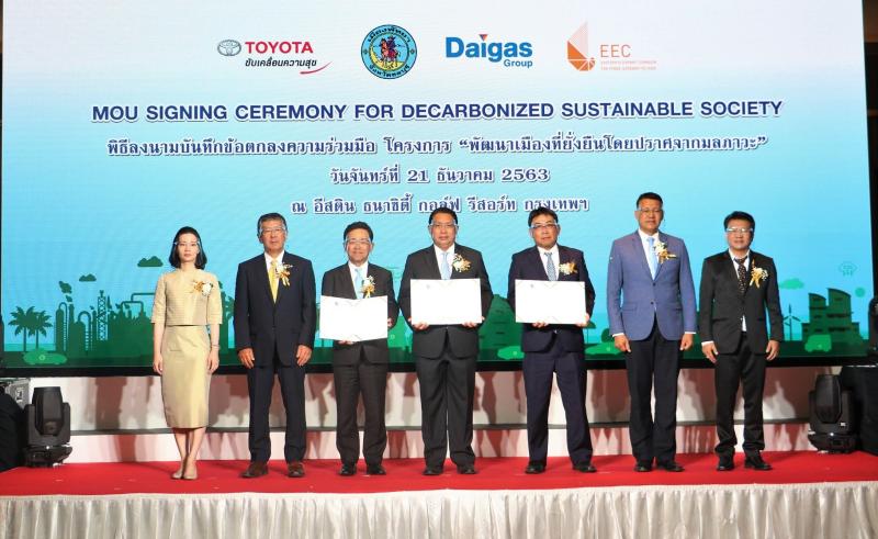 นายสนธยา คุณปลื้ม นายกเมืองพัทยา นายมิจิโนบุ ซึงาตะ กรรมการผู้จัดการใหญ่ บริษัท โตโยต้า มอเตอร์ ประเทศไทย จำกัด นายชุนซาคุ นากาอิ กรรมการผู้จัดการ บริษัท โอซาก้า แก๊ซ จำกัด ร่วมพิธีลงนามความร่วมมือ “โครงการการจัดตั้งเมืองที่ยั่งยืนโดยปราศจากมลภาวะ” “Decarbonized Sustainable City” เพื่อร่วมศึกษาและวางรากฐานต้นแบบในการพัฒนาเมืองแห่งอนาคต โดยนำเทคโนโลยีรถยนต์พลังงานทางเลือกและระบบพลังงานสะอาดมาทดลองใช้งาน ทั้งในด้านการคมนาคม เศรษฐกิจ และการพัฒนาด้านสิ่งแวดล้อมอย่างยั่งยืน โดยมี ฯพณฯ นายนะชิดะ คะสุยะ เอกอัครราชทูตวิสามัญผู้มีอำนาจเต็มแห่งญี่ปุ่น ประจำราชอาณาจักรไทย และ ดร. ลัษมณ อรรถาพิช รองเลขาธิการ สายงานการลงทุนและความร่วมมือระหว่างประเทศ สำนักงานคณะกรรมการนโยบายเขตพัฒนาพิเศษภาคตะวันออก ให้เกียรติเป็นสักขีพยาน ณ โรงแรมอีสติน ธนาซิตี้ กอล์ฟ รีสอร์ต กรุงเทพฯ ในวันที่ 21 ธันวาคม 2563