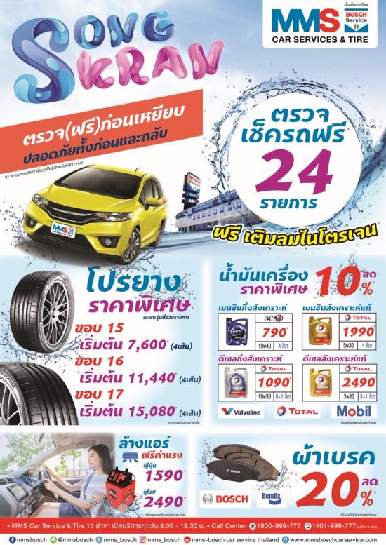 พร้อมกันนี้ยังได้จัดรายการโปรโมชั่นอื่นๆ ได้แก่ ยางรถยนต์ ยี่ห้อคอนติเนนทอล (Continental) ลด 35% ทุกขนาด อาทิ ขนาด 175/65R17 ราคา 7,670 บาท, ขนาด195/65R15 ราคา 8,060 บาท ,215/60R15 ราคา 11,440 บาทฯลฯ สามารถผ่อนอัตราดอกเบี้ย 0% ได้นาน 10 เดือน, เปลี่ยนน้ำมันเครื่อง ฟรีค่าแรง+ฟรีกรอง Bosch (เฉพาะรถญี่ปุ่น) , น้ำมันเครื่องเบนซินกึ่งสังเคราะห์Elf 10W40 ราคา 790 บาท, เบนซิน สังเคราะห์แท้ โททาล (TOTAL) 5W30 ราคา 1,990 บาท,ดีเซล กึ่งสังเคราะห์โททาล (TOTAL)10W30ราคา 1,090 บาท, ดีเซล สังเคราะห์แท้โททาล (TOTAL) 5W30ราคา 2,490บาท ,พร้อมโปรแกรมล้างแอร์รถญี่ปุ่น 1,590 บาท รถยุโรป 2,490 บาท, น้ำยาหล่อเย็น รถญี่ปุ่นฟรีค่าแรง รถยุโรปค่าแรงลด 50%, น้ำมันเบรกโททาล(TOTAL) วาวโวลีน (Valvoline) และ โมบิล (Mobil) ลดพิเศษ 20%, ผ้าเบรก บ๊อซ (Bosc) และ เบนดิกซ์ (Bendix) ลดราคา 20% รวมถึงระบบช่วงล่างที่สามารถผ่อน 0% ได้นาน 6 เดือน ตั้งแต่วันนี้ถึง 30 เมษายน ศกนี้ ทั้งนี้ลูกค้าที่สนใจใช้บริการสารถติดต่อจองคิวเพื่อเข้ารับบริการได้ที่ Line @mmsbosch และ เฟสบุ๊ค mms Bosch car service