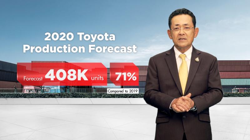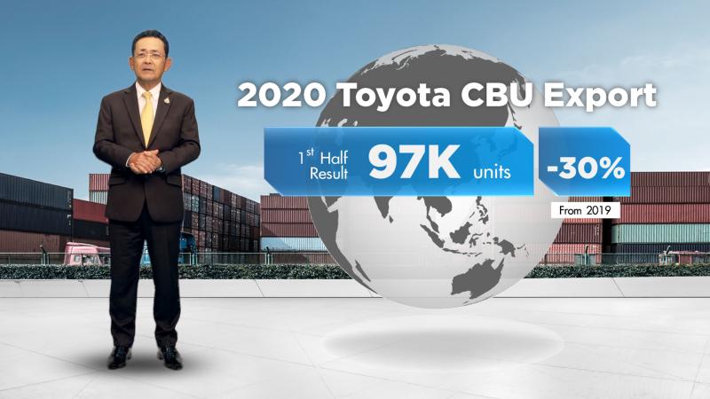 สำหรับการส่งออกในครึ่งปีแรก 2563 ของโตโยต้าได้ส่งออกรถยนต์สำเร็จรูปจำนวนทั้งสิ้น 97,000 คัน ลดลง 30% จากช่วงเวลาเดียวกันของปีที่ผ่านมา อย่างไรก็ดี เราได้เห็นสัญญาณเชิงบวกจากในภูมิภาคโอเชียเนียและบางประเทศในทวีปเอเชีย ด้วยเหตุนี้ เราจึงปรับการคาดการณ์การส่งออกรถยนต์สำเร็จรูปสำหรับปีนี้ทั้งปี อยู่ที่ 194,000 คัน หรือคิดเป็น 73% เมื่อเทียบกับปีที่แล้ว ในส่วนของการผลิตรถยนต์ของเรานั้น ก็เป็นไปตามสภาวะของตลาดรถยนต์ทั้งในประเทศและต่างประเทศซึ่งมีแนวโน้มเติบโตขึ้นเหนือกว่าที่เราได้คาดการณ์ไว้ ดังนั้น จำนวนการผลิตรถยนต์ของโตโยต้าในปี 2563 จะอยู่ในระดับที่ 408,000 คัน คิดเป็น 71% เมื่อเทียบกับยอดการผลิตของปีที่ผ่านมา”