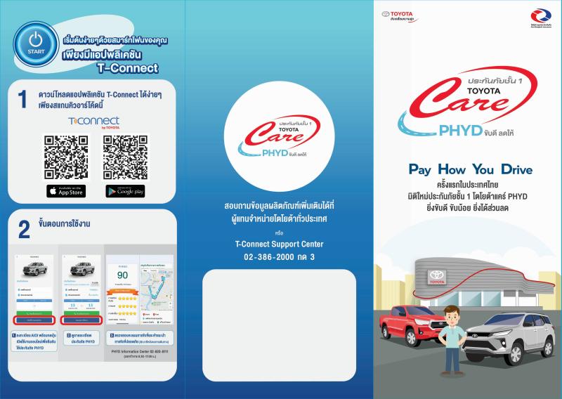 สำหรับปี 2563 โตโยต้าได้มีการพัฒนาไปอีกขั้นกับประกันภัยรูปแบบใหม่ เพื่อยกระดับประกันภัยให้เหมาะสมกับการใช้ชีวิตและพฤติกรรมการขับขี่ ภายใต้ประกันภัยชั้น 1 โตโยต้าแคร์ “ขับดี ลดให้” (Toyota Care PHYD – Pay How You Drive) โดยการวิเคราะห์ข้อมูล ระยะทางการใช้งาน และพฤติกรรมการขับขี่ของลูกค้า นำมาคำนวณคะแนนการขับขี่พร้อมข้อแนะนำเพื่อปรับปรุงในการขับขี่อย่างปลอดภัยมากยิ่งขึ้น ผ่านเทคโนโลยี T-Connect ใหม่ เป็นเทคโนโลยีที่จะขับเคลื่อนคุณไปทุกที่ ด้วยความเชื่อมั่น ปลอดภัย และไร้กังวล รองรับทุกไลฟ์สไตล์เพื่ออนาคต