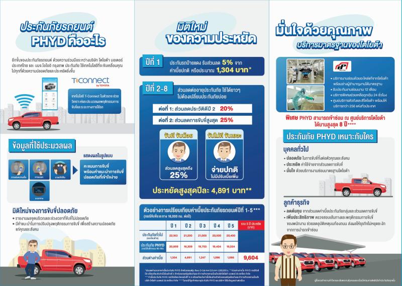 - ประกันภัย โตโยต้า แคร์ ขับดีลดให้ (PHYD) รองรับรถยนต์โตโยต้าที่มีเทคโนโลยี T-Connect ใหม่ ได้แก่ ไฮลักซ์ รีโว่ ใหม่ และฟอร์จูนเนอร์ ใหม่ ที่แนะนำปี 2563 เป็นต้นไป